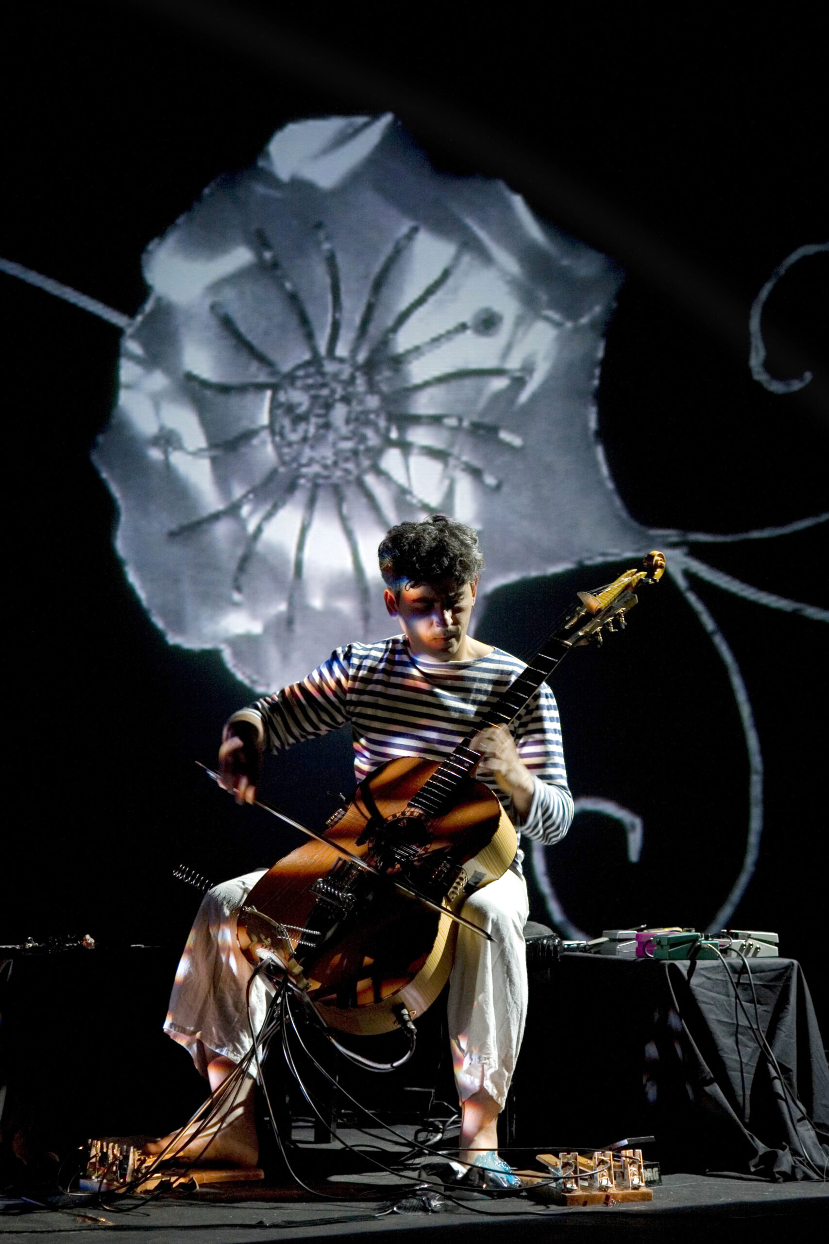 With twenty-five strings currently involved in his instrument, Angeli plays a one man show like no other. His guitar brings sounds of the cello, piano, sitar, kora and harp together while his drum pedals build any rhythm he desires simultaneously. Angeli continues to evolve his instrument as he has over the past thirty years and has an intimate connection with it.