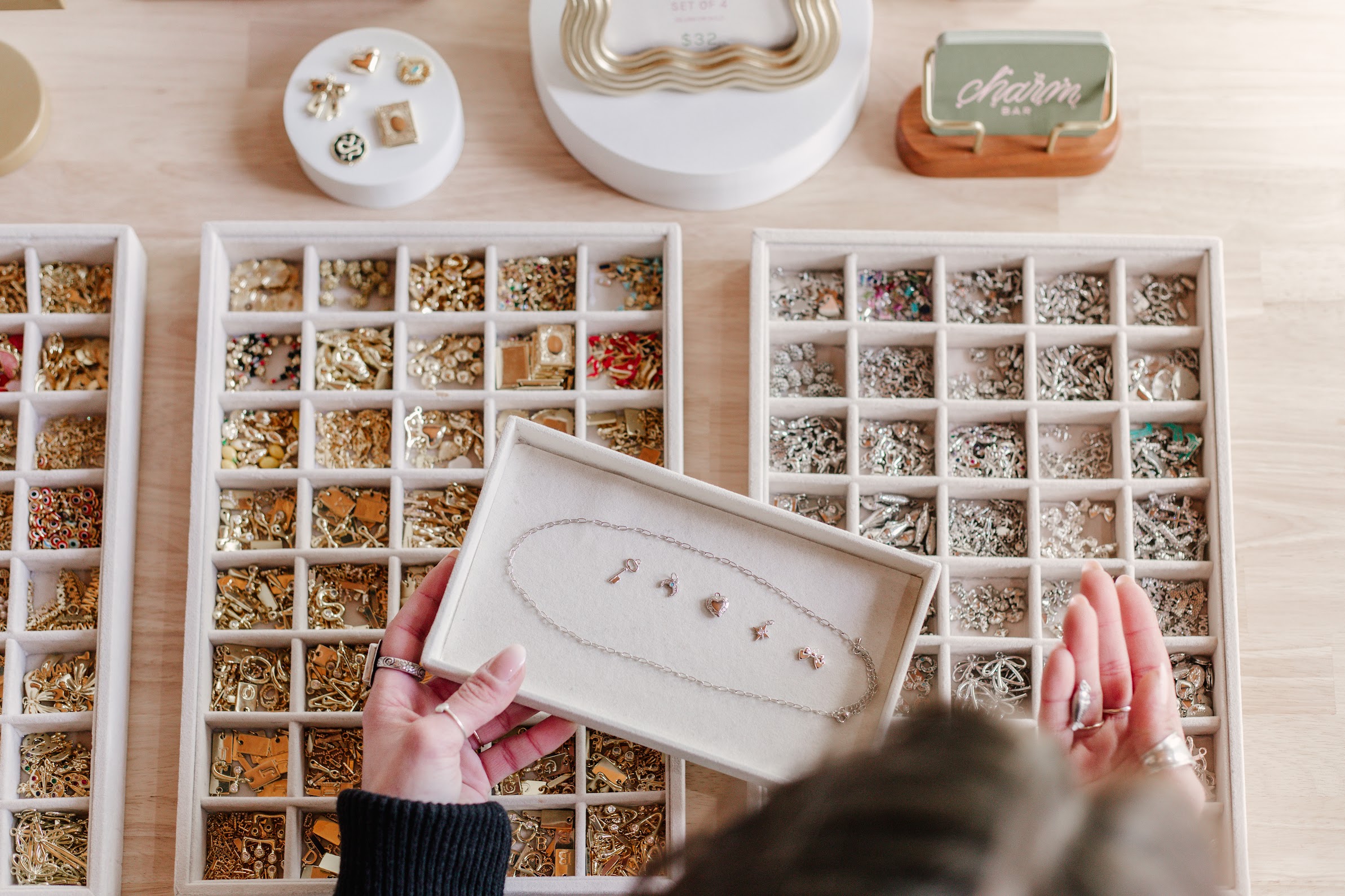 Approaching a charm bar with rows of options, materials, accessories and more can feel overwhelming to the untrained eye. Ali encourages customers to start curating based on a feeling or story, “Is there a memory, dream, or vibe you want to hold onto? Maybe it’s a moon for the night you felt free, or a flower that reminds you of a loved one. Pick one or two pieces that speak to you and build around them,” shared Ali.