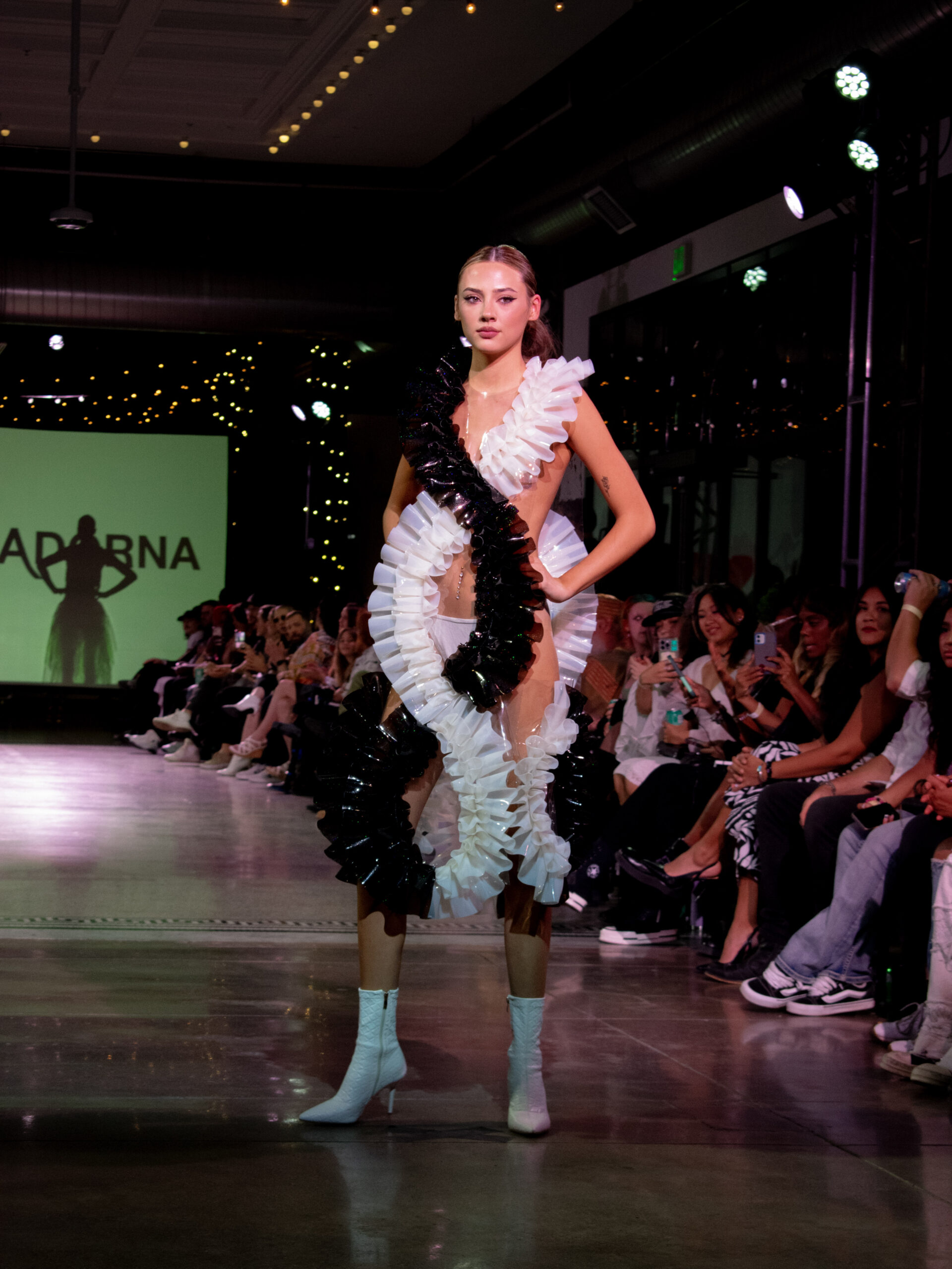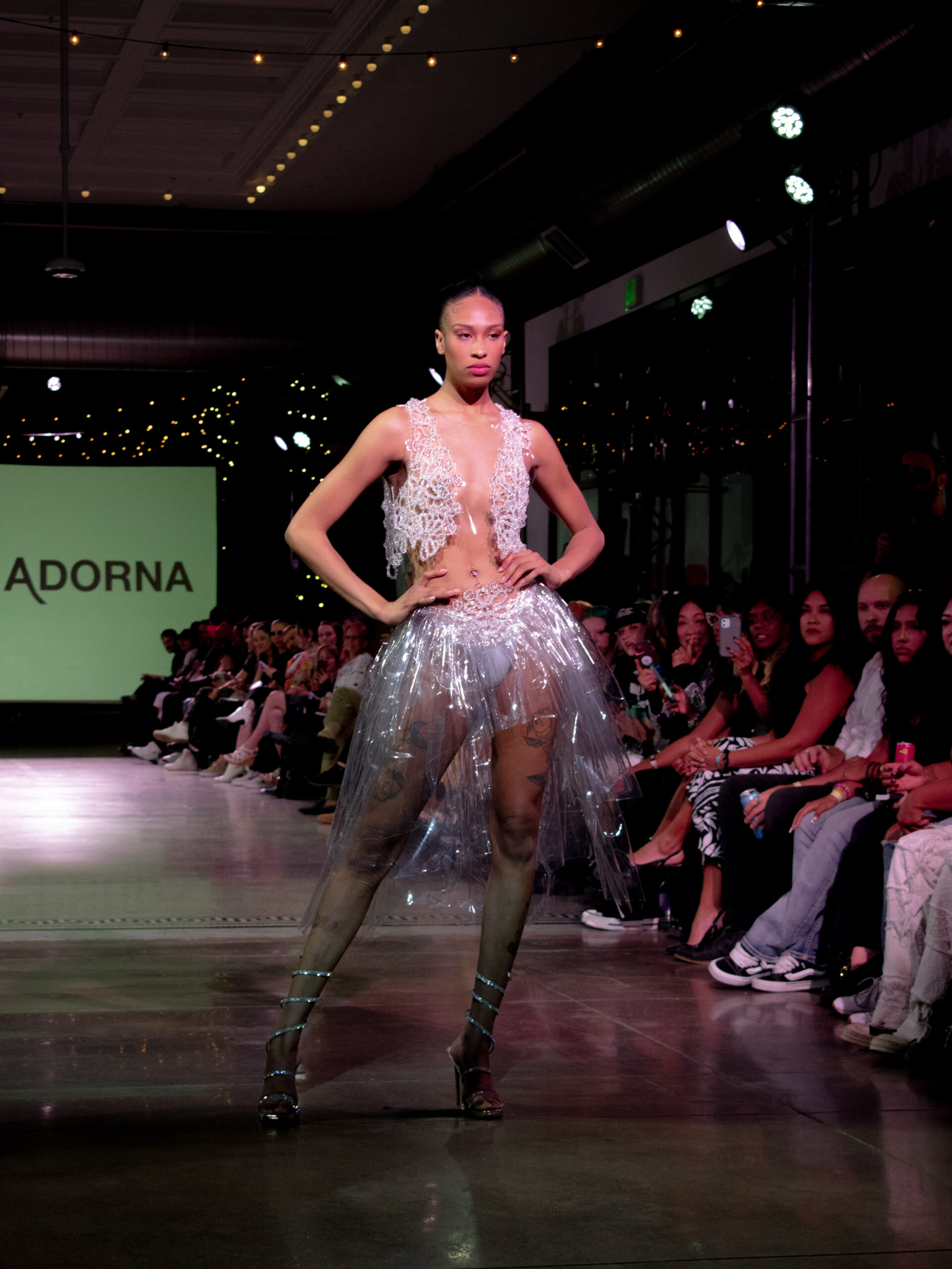 And with that, the series finale officially commenced. Up first was designer Brittany Schall of La Adorna. Previously featured in Harper’s BAZAAR, it was a treat for all to witness these one-of-a-kind wearable art pieces. La Adorna has a knack for utilizing unique colors and unexpected materials. However, designer Schall was up for the challenge of curating a collection fit for the occasion.
