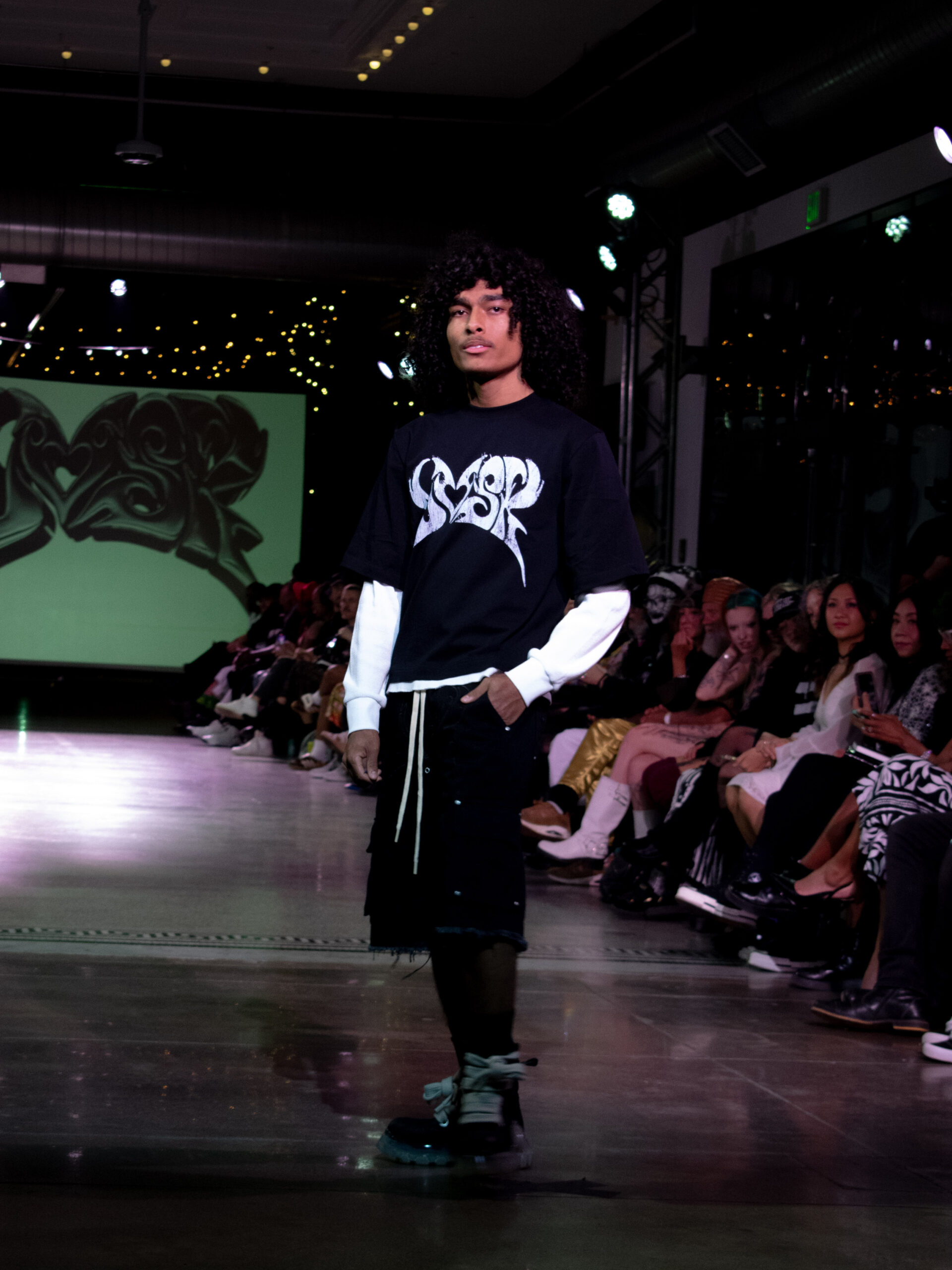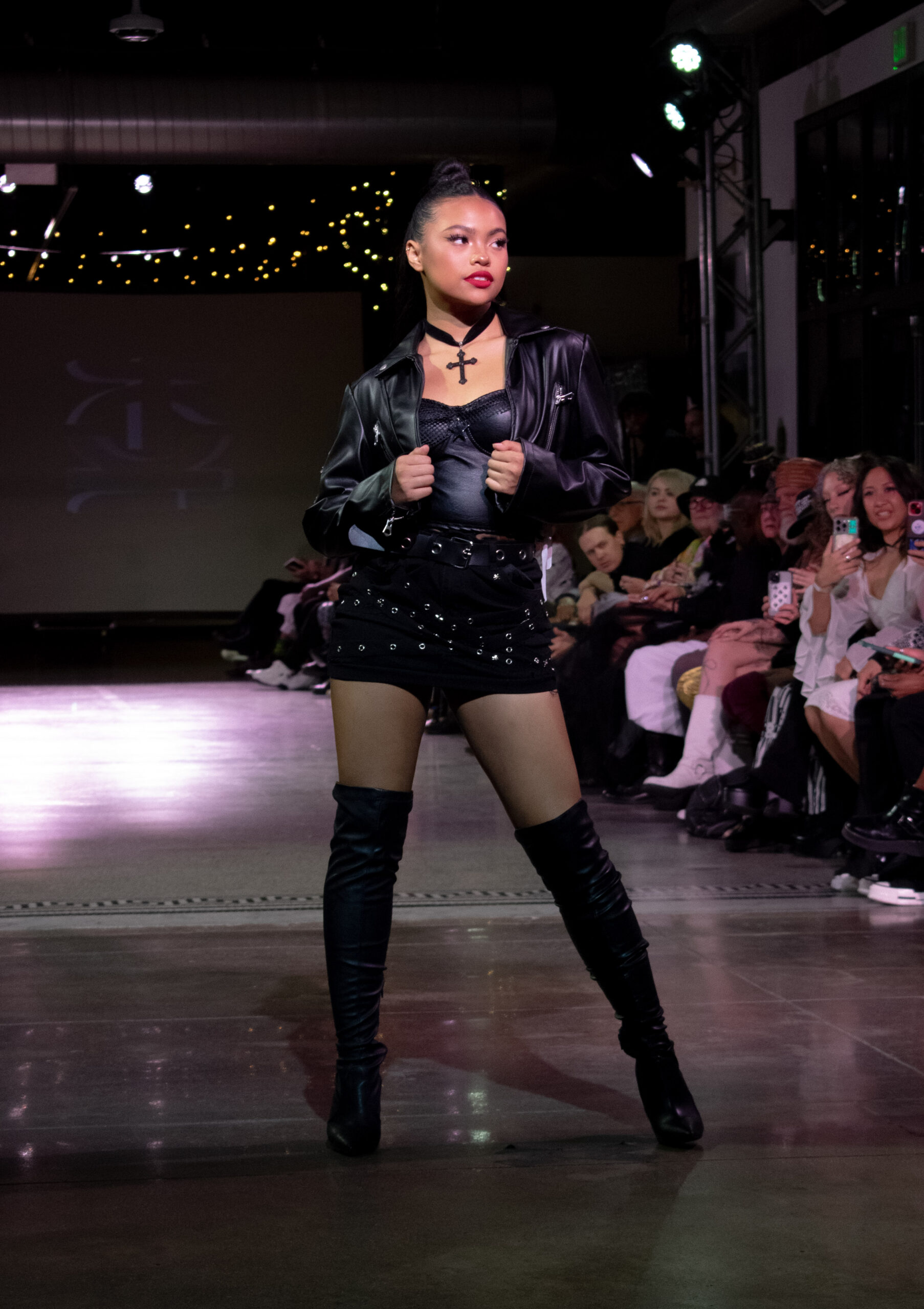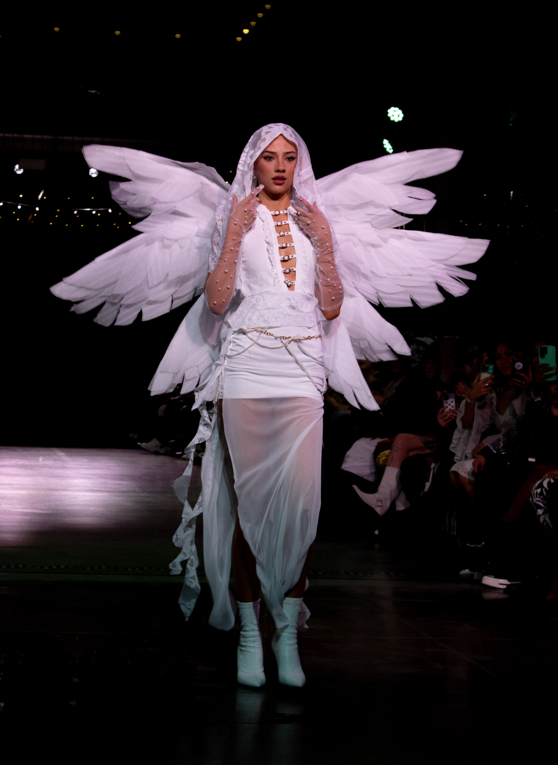 Entering the whimsical world of forces that operate under light or dark energies comes designer Nagisa Corbett of Tokiprism. Corbett earnestly spoke about the symbolism of dark and light energies and how she wanted that to appear on the runway. These natural emotions have hit everyone and this collection was a reminder to embrace them and have balance. Tokiprism leaned into edgy, goth and cyberpunk aesthetics and designs throughout the collection. Each look was inviting and creative, and her signature logo was included. Models wore outfits that fit any occasion from street style, rave to formal attire, these disruptive looks made sure to include goth details like chains, grommets, studs and corset detailing. When we thought we’d seen it all, an angel appeared. Corbett flawlessly ended the show by dressing a model in all white with angelic accessories and details including large feather angel wings and a lace coif. Made out of recycled materials and fabrics, Tokiprism’s one of a kind designs was the perfect ending to the black and white affair.