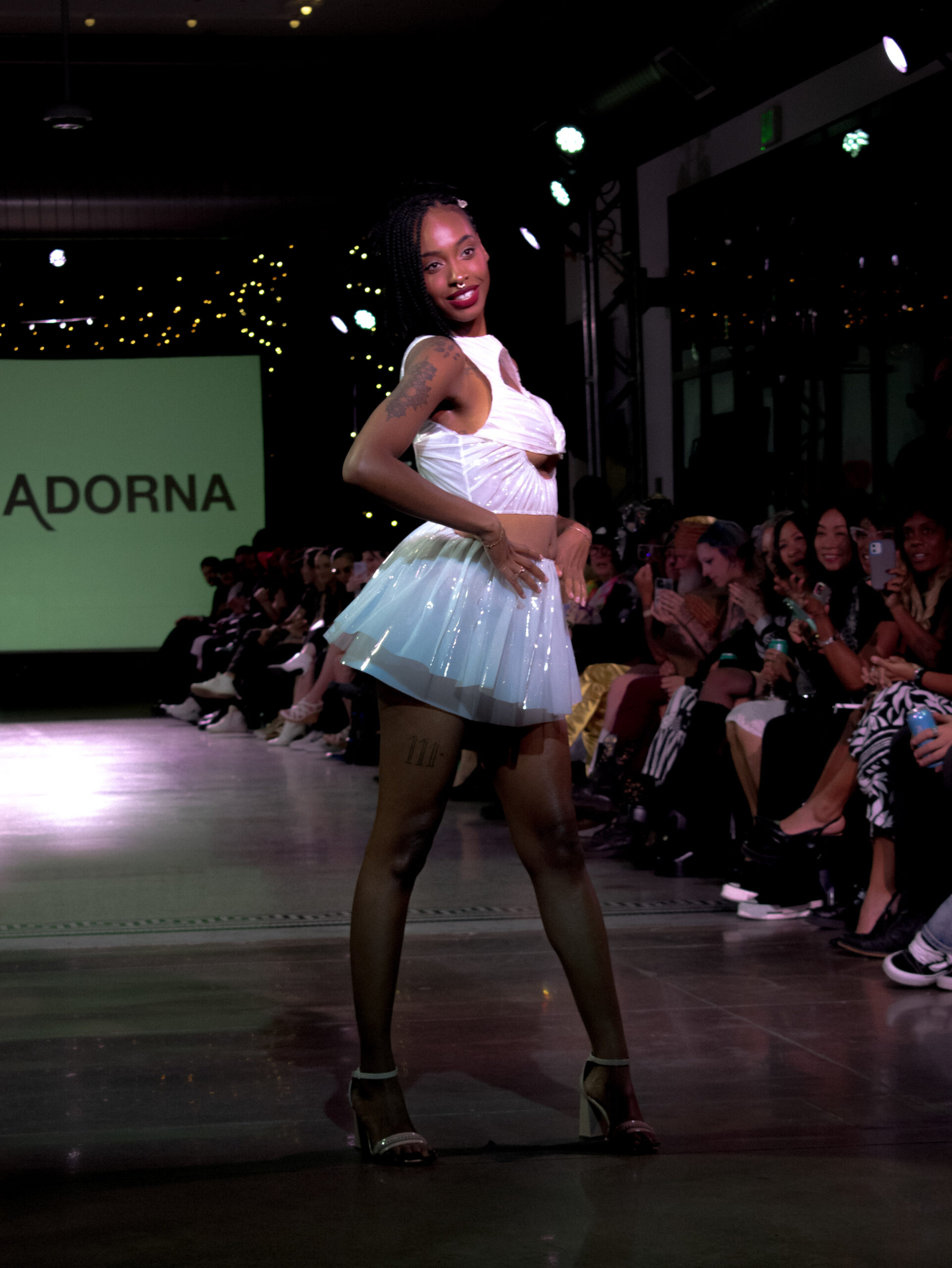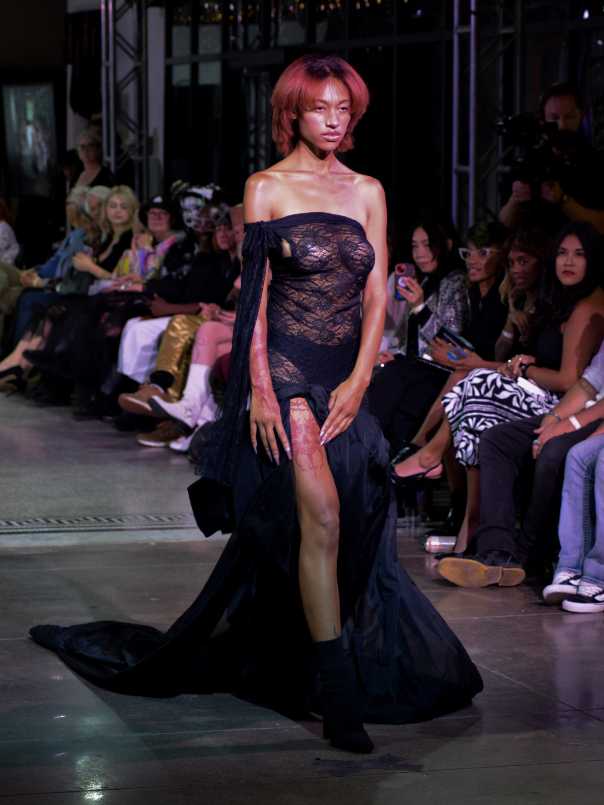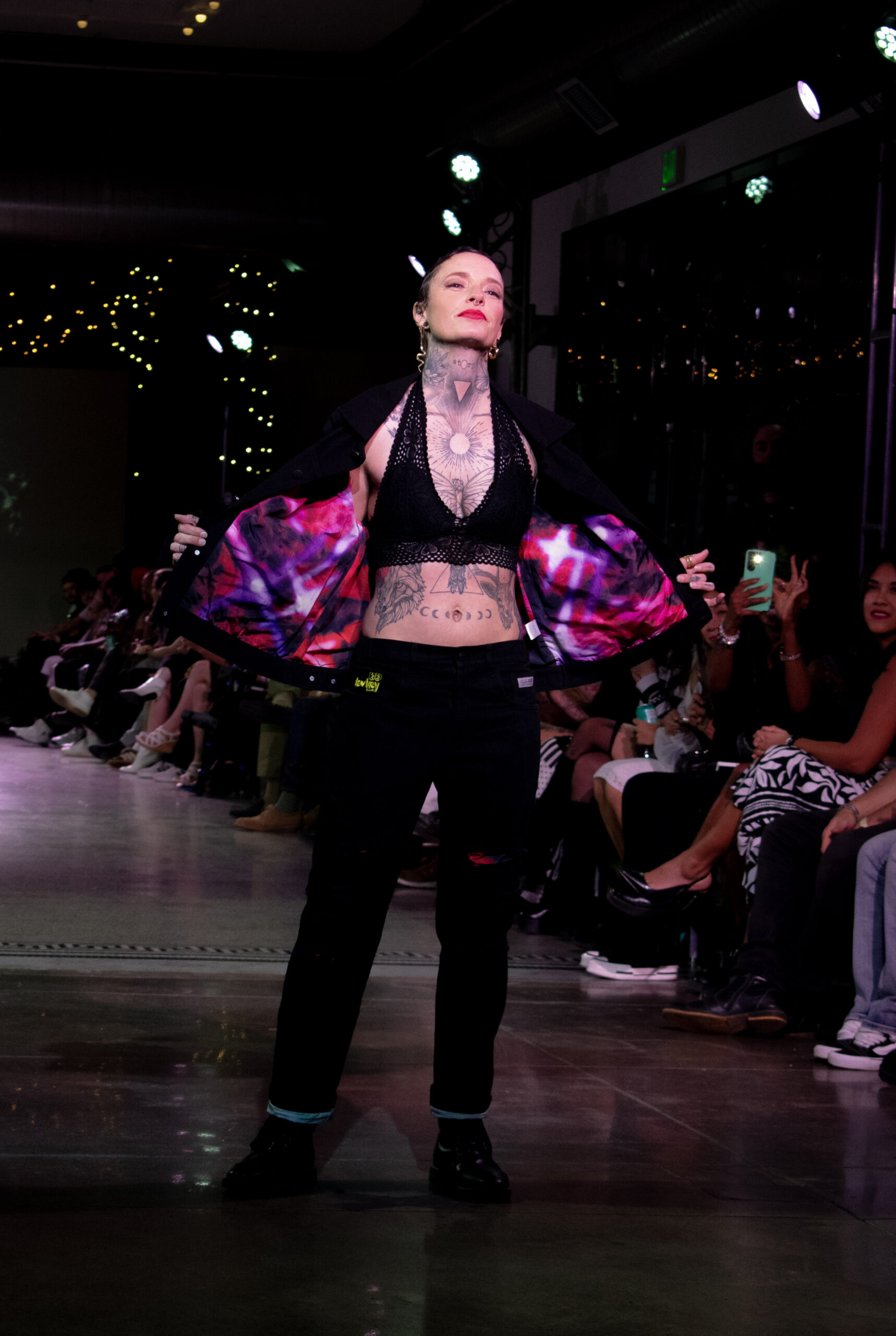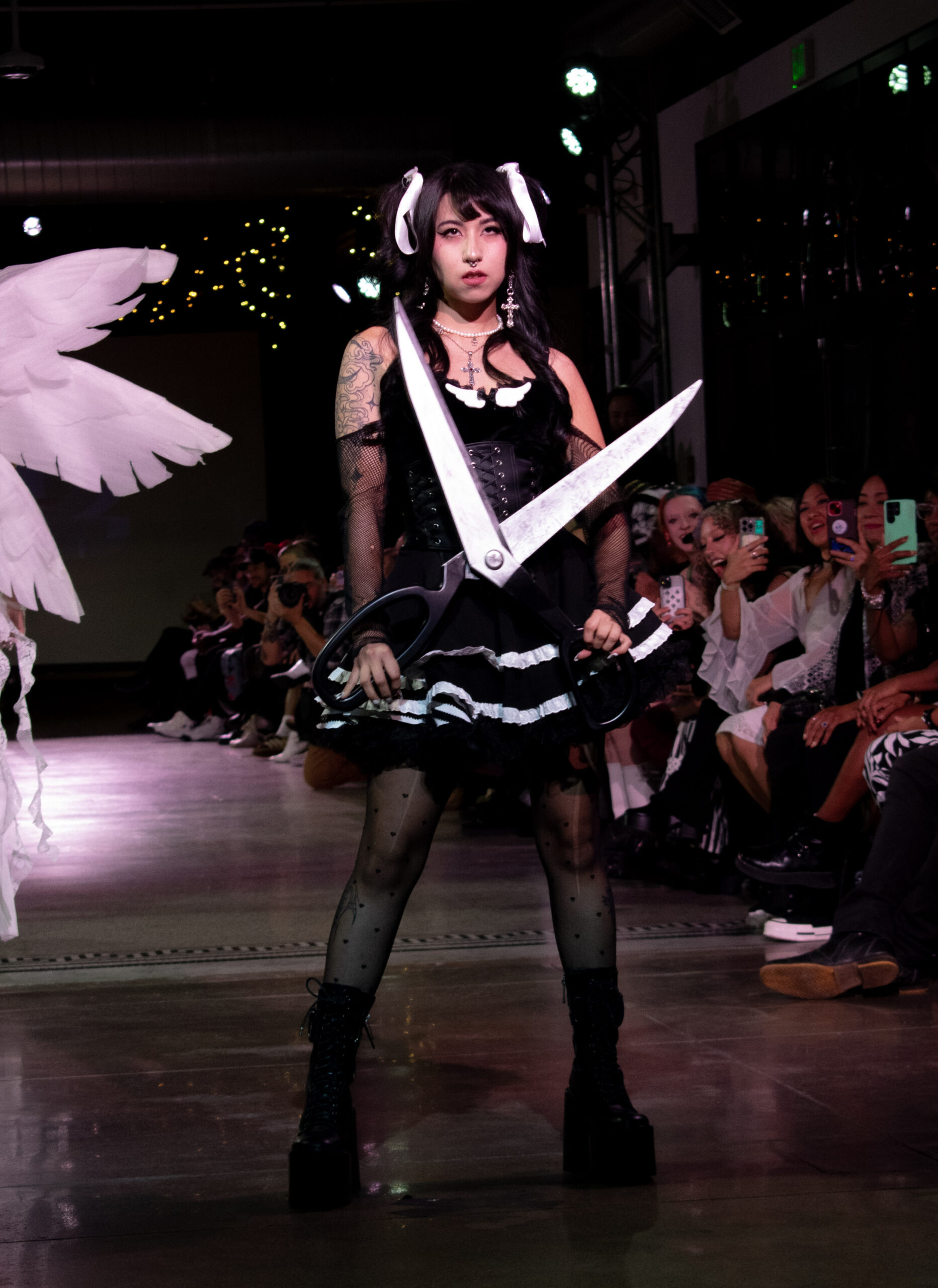 Entering the whimsical world of forces that operate under light or dark energies comes designer Nagisa Corbett of Tokiprism. Corbett earnestly spoke about the symbolism of dark and light energies and how she wanted that to appear on the runway. These natural emotions have hit everyone and this collection was a reminder to embrace them and have balance. Tokiprism leaned into edgy, goth and cyberpunk aesthetics and designs throughout the collection. Each look was inviting and creative, and her signature logo was included. Models wore outfits that fit any occasion from street style, rave to formal attire, these disruptive looks made sure to include goth details like chains, grommets, studs and corset detailing. When we thought we’d seen it all, an angel appeared. Corbett flawlessly ended the show by dressing a model in all white with angelic accessories and details including large feather angel wings and a lace coif. Made out of recycled materials and fabrics, Tokiprism’s one of a kind designs was the perfect ending to the black and white affair.