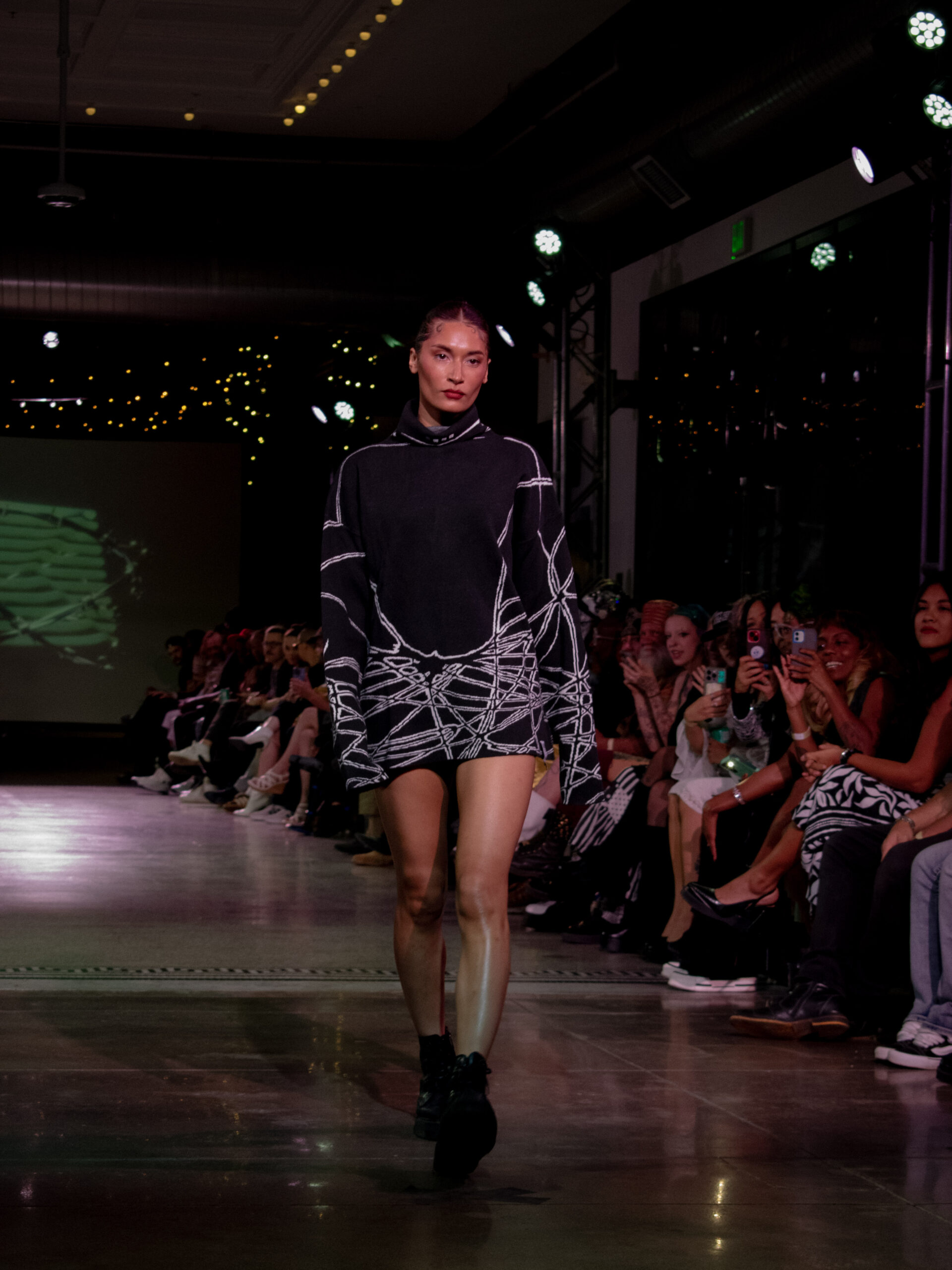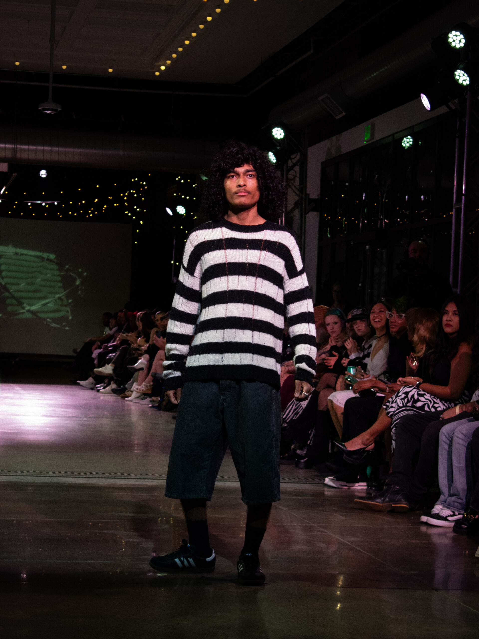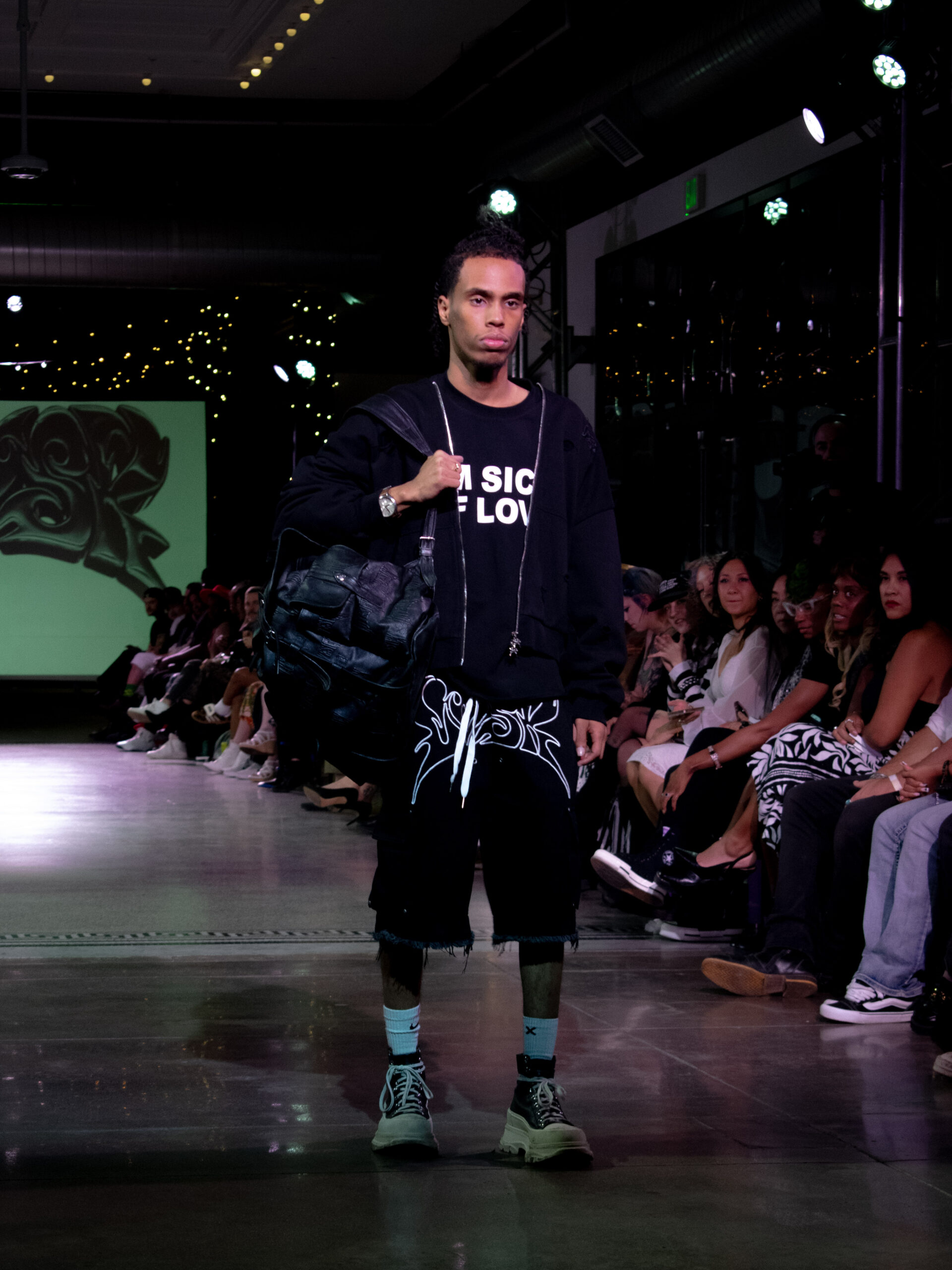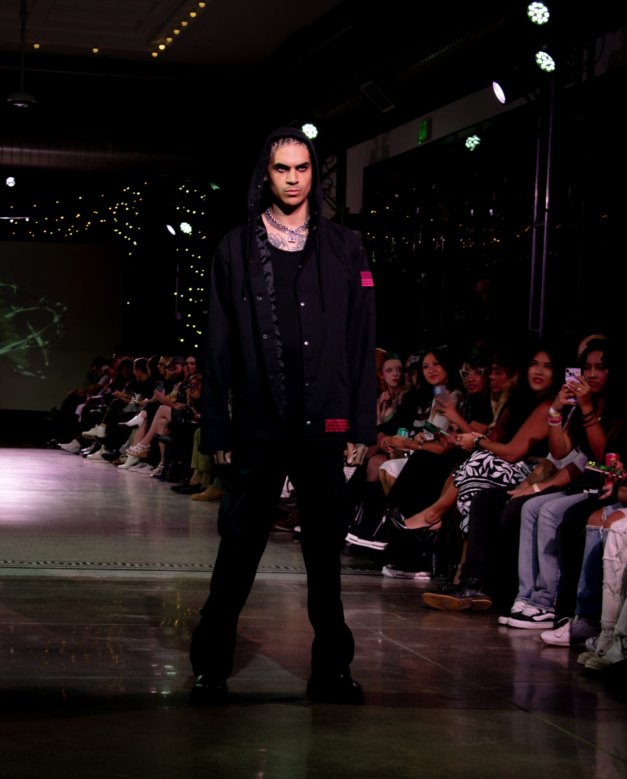 Designer Rafee Hagop of Lowkey Industries provided a grunge collection perfect for spooky season. This collection had an effortless appeal but didn’t shy away from including minor details that made a big impact. Black was the main base for each look while different fabrics like denim, knit, velvet and cotton remained as the consistent textiles throughout the collection. Models strolled down the runway in everyday attire like sweaters, denim jackets, baggy jeans, hoodies and a matching sweatsuit. Lowkey Industries took everyday attire and customized them with signature barbed-wire designs signifying “self-defense and boundaries,” or adding mini silver key embellishments to a classic knit sweater, along with the show stopper, a red and purple satin lining, to add an extra kick to a black denim jacket.