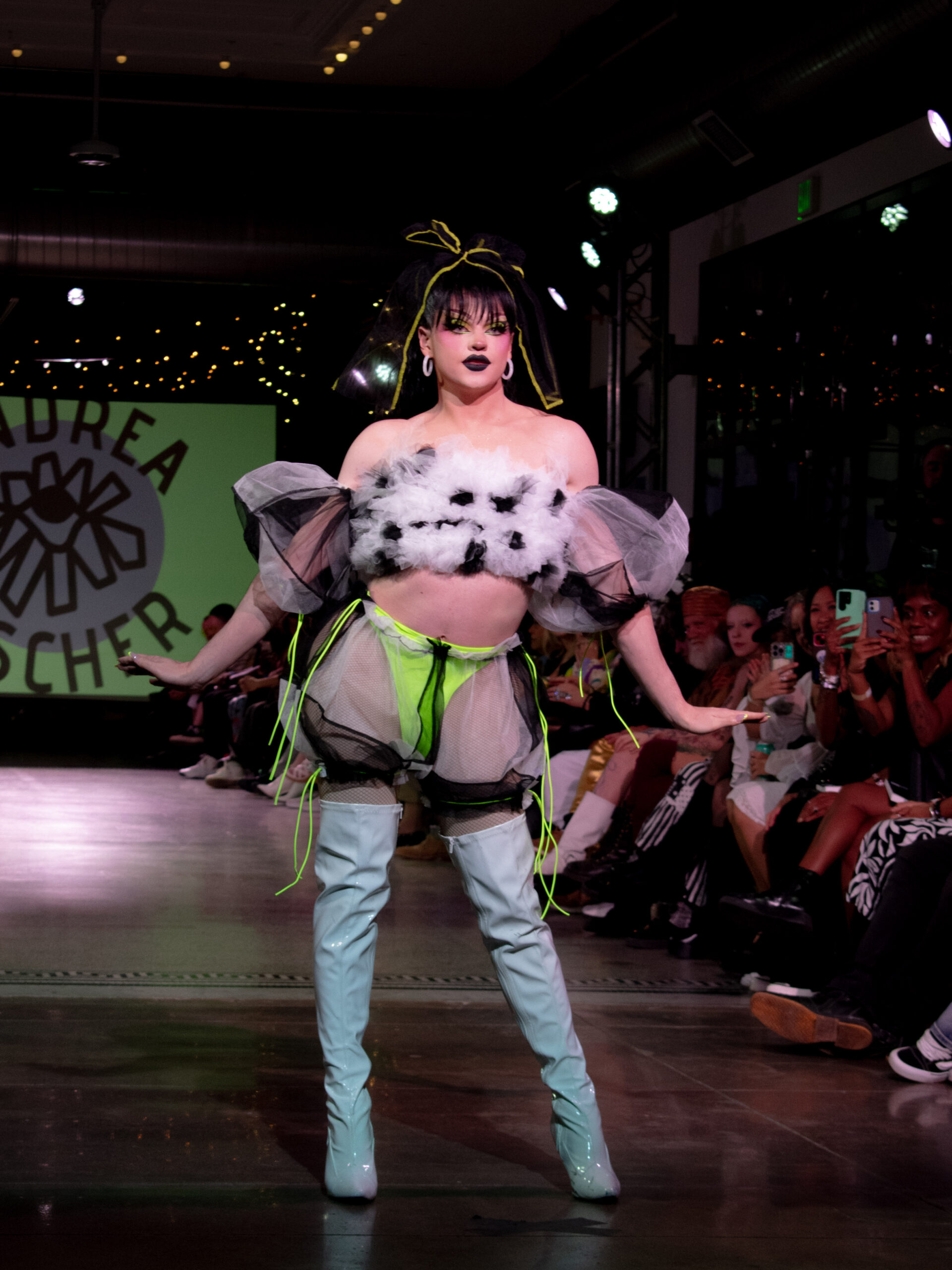 Known for her bright and festival-like designs, Andrea Fischer is the queen of all things vibrant and colorful. We’re almost tempted to think Brat green was inspired by Fischer herself! Nonetheless, Fischer took on the challenge of turning down the hues and going full greyscale and did it well. The collection was still classic Fischer with a dark twist and proved that black and white does not have to be boring. This imaginative collection utilized sheer black and white tulle and patchwork cotton fabrics that made each piece unique and versatile. A matching top and skirt piece made completely out of tinsel and hair from Half Sweet Studios stunned the crowd. Fischer also included a patchwork menswear outfit of our dreams made out of t-shirts from her original t-shirt brand, Mean People Suck. While staying true to the challenge and her colorful roots, Fischer included a hint of her signature lime green throughout the collection in the form of drawstrings in each look.