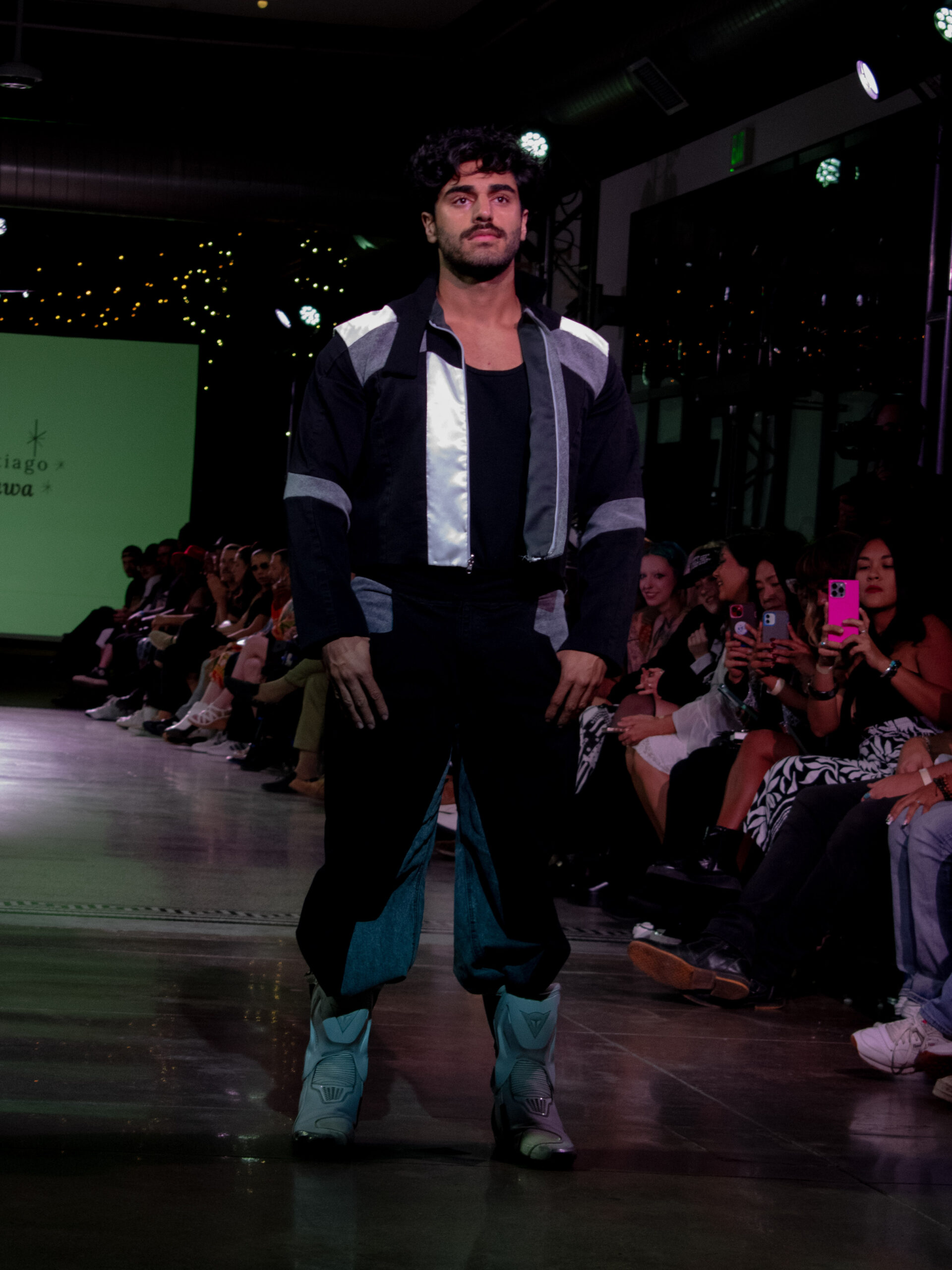 All the allure and beauty of the mid-century 1960s fashion was resurrected on the runway with a modern twist through the taste and talent of designer Santiago Sirawa. Sirawa’s vintage state of mind brought several elevated and elegant pieces to life with ease. Known for his gorgeous vintage dress designs, Sirawa introduced a menswear outfit for the first time down the runway. Menswear is having its moment this year and vintage staple pieces have been a source of inspiration to all. This look came together with baggy denim pants detailed with grey patches alongside a matching jacket with iridescent satin patches. This mini black and white collection moved towards sexy and tighter fits rather than Sirawa’s typical flowy dresses. A jaw-dropping piece like the polka dot and velvet mini dress with cut-out side seams worked the room while hinting at Sirawa’s use of vintage inspiration.