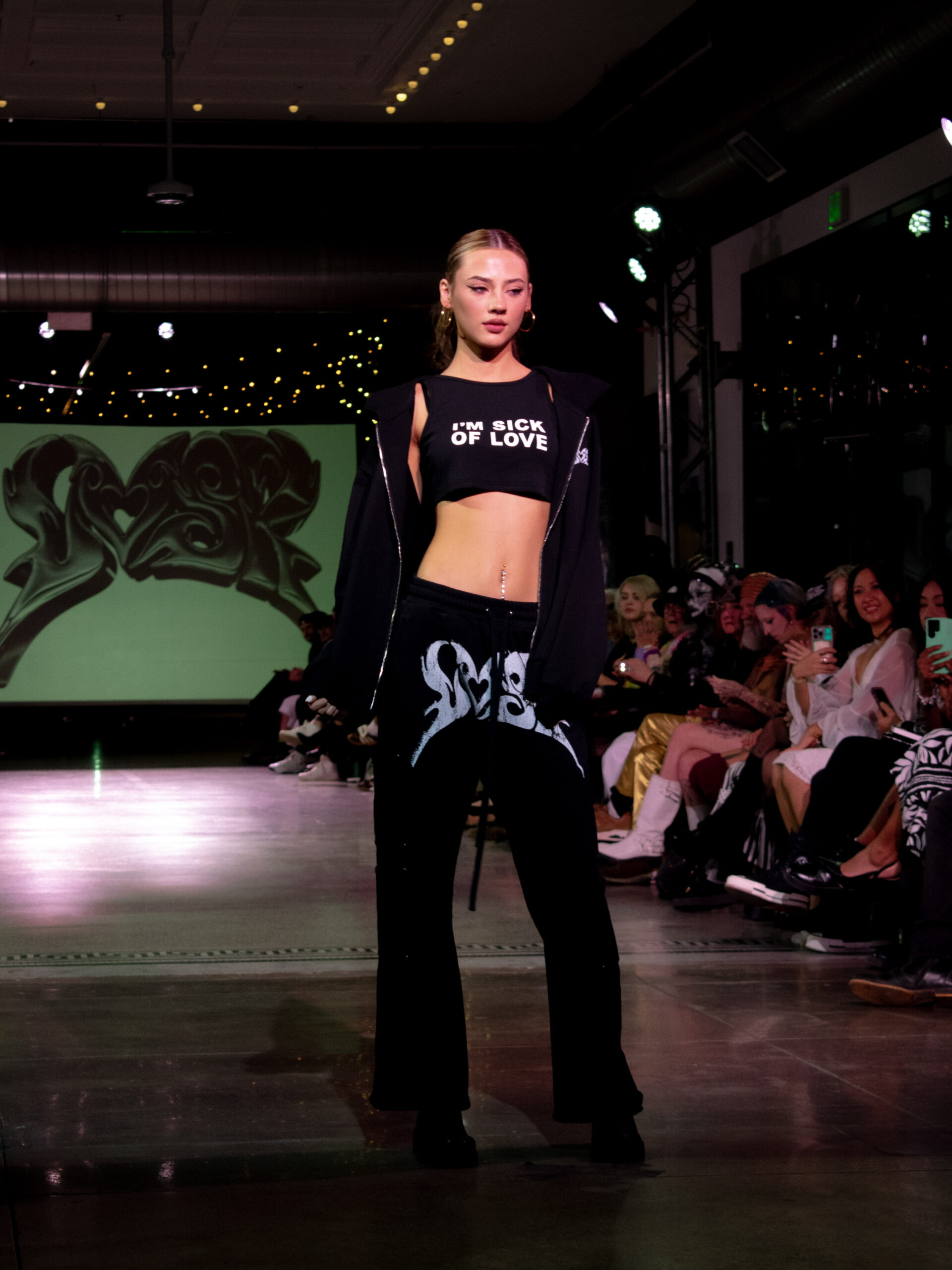 Streetwear brought us back to the present day through designer Shohruhhon Ganiev of Lovesick. On the verge of entering five years of business, this streetwear brand almost stole the show with this cohesive line made for the rebel with a heart. Each look was carefully curated reminding us that cold weather ready looks work best with more layers and dimension. The use of the iconic Lovesick logo and “I’m Sick of Love” tagline throughout each look brought an element of nostalgia to a time when brand recognition and storytelling were at the height of fashion through the bold and blatant incorporation of trademarks. Lovesick’s black and white collection was striking and brought an exclusive and luxurious element to street style apparel.