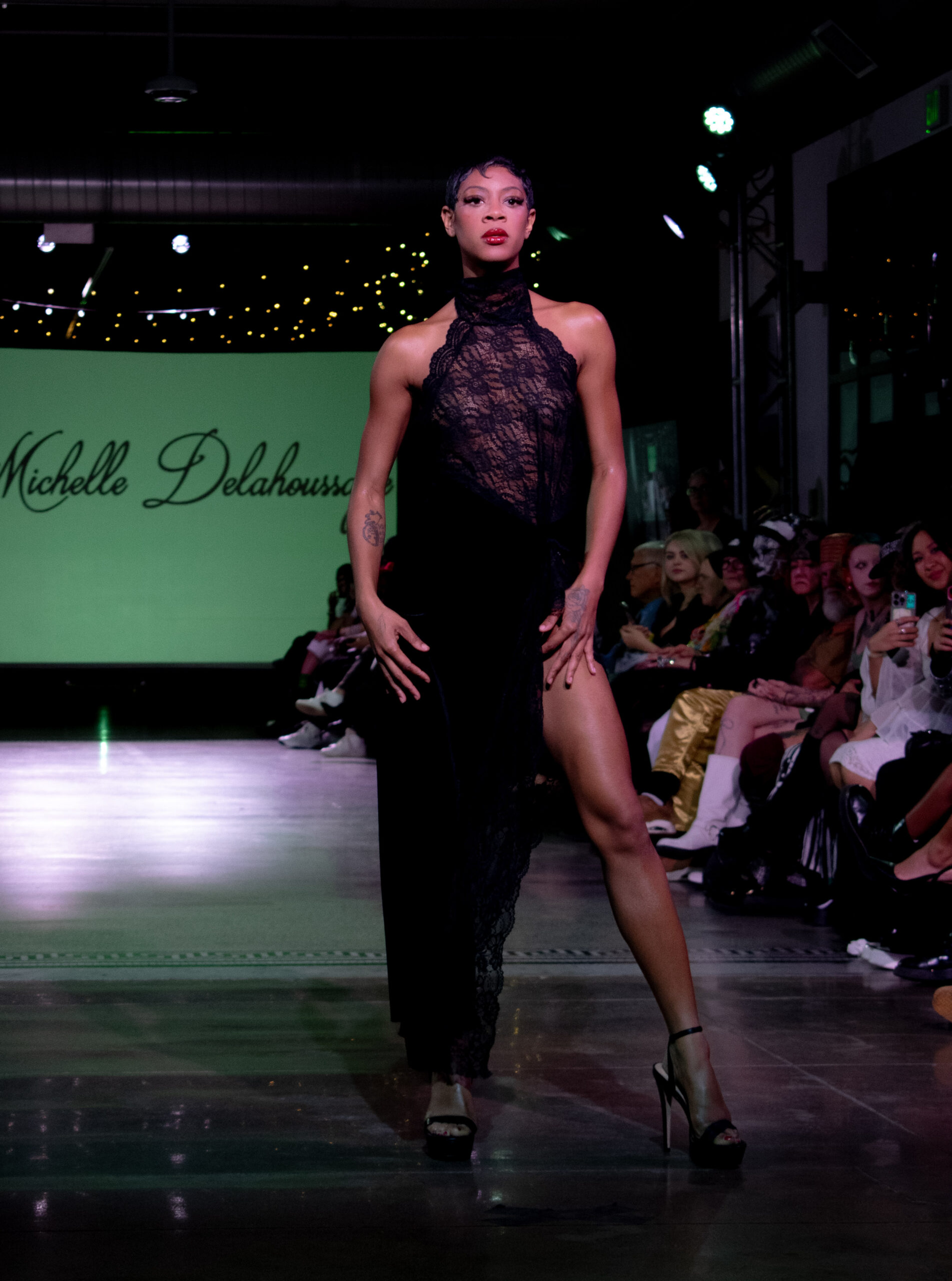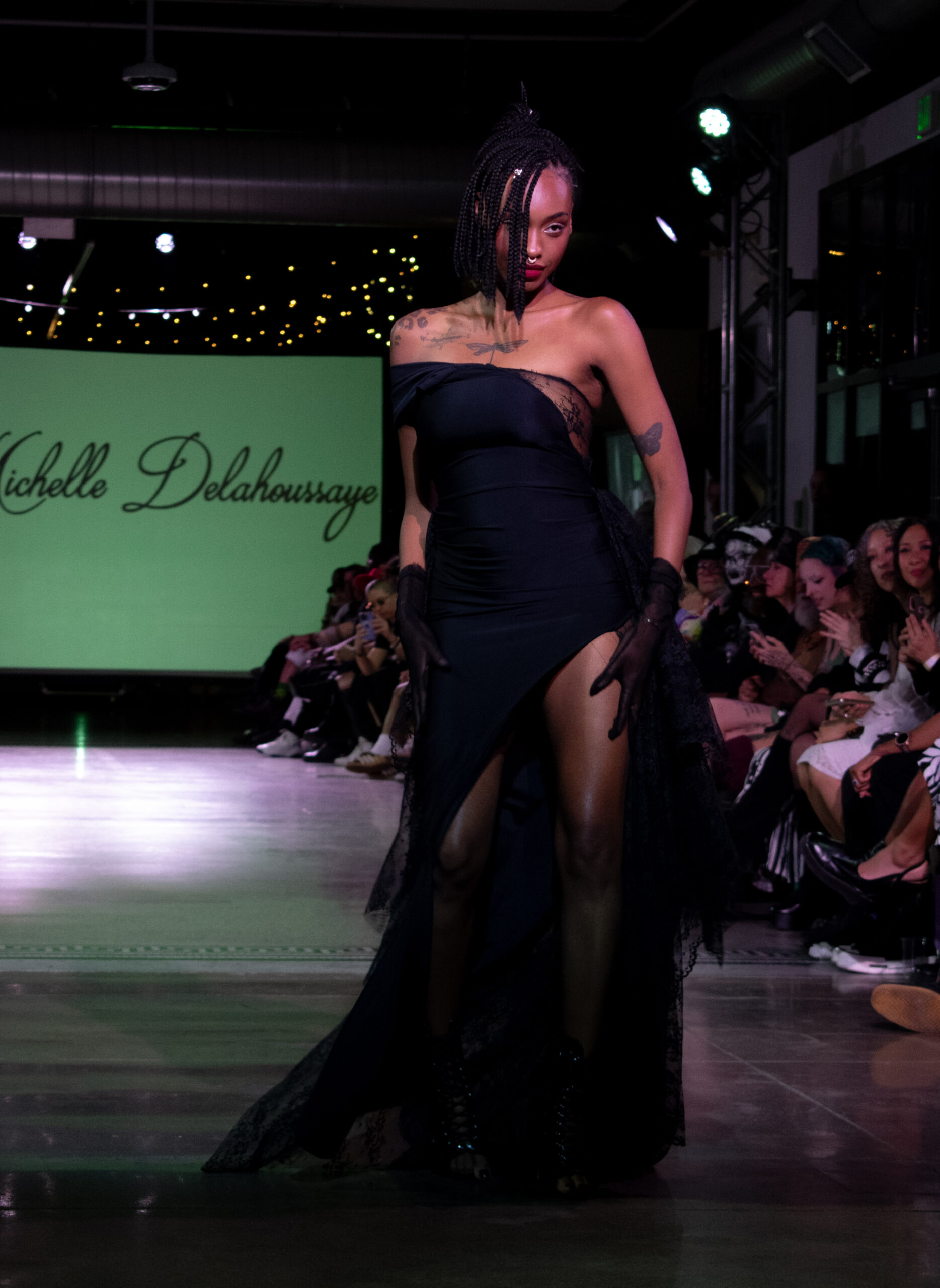 When we think of the iconic Michelle Obama quote, “Girl you have done it again constantly raising the bar for us all and doing it flawlessly. I’d like to say I’m surprised but I know who you are,” we immediately think of designer Michelle Delahoussaye. Putting a modern twist on French queen and fashion icon Marie Antoinette, Delahoussaye stunned the crowd with a collection of sexy and extravagant black gowns. Delahoussaye has a knack for creating showstopping evening wear dresses and felt right in her element working with darker shades.