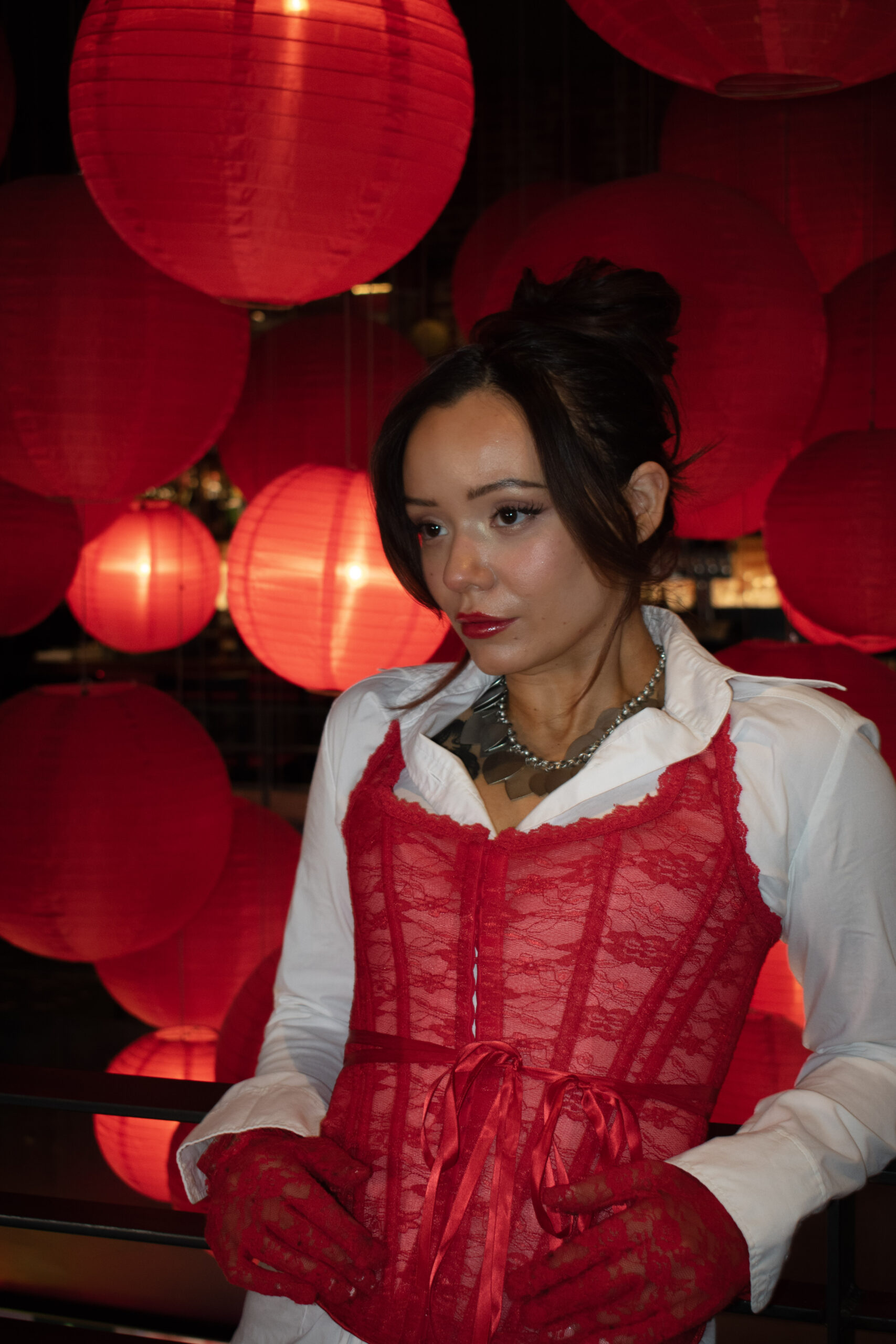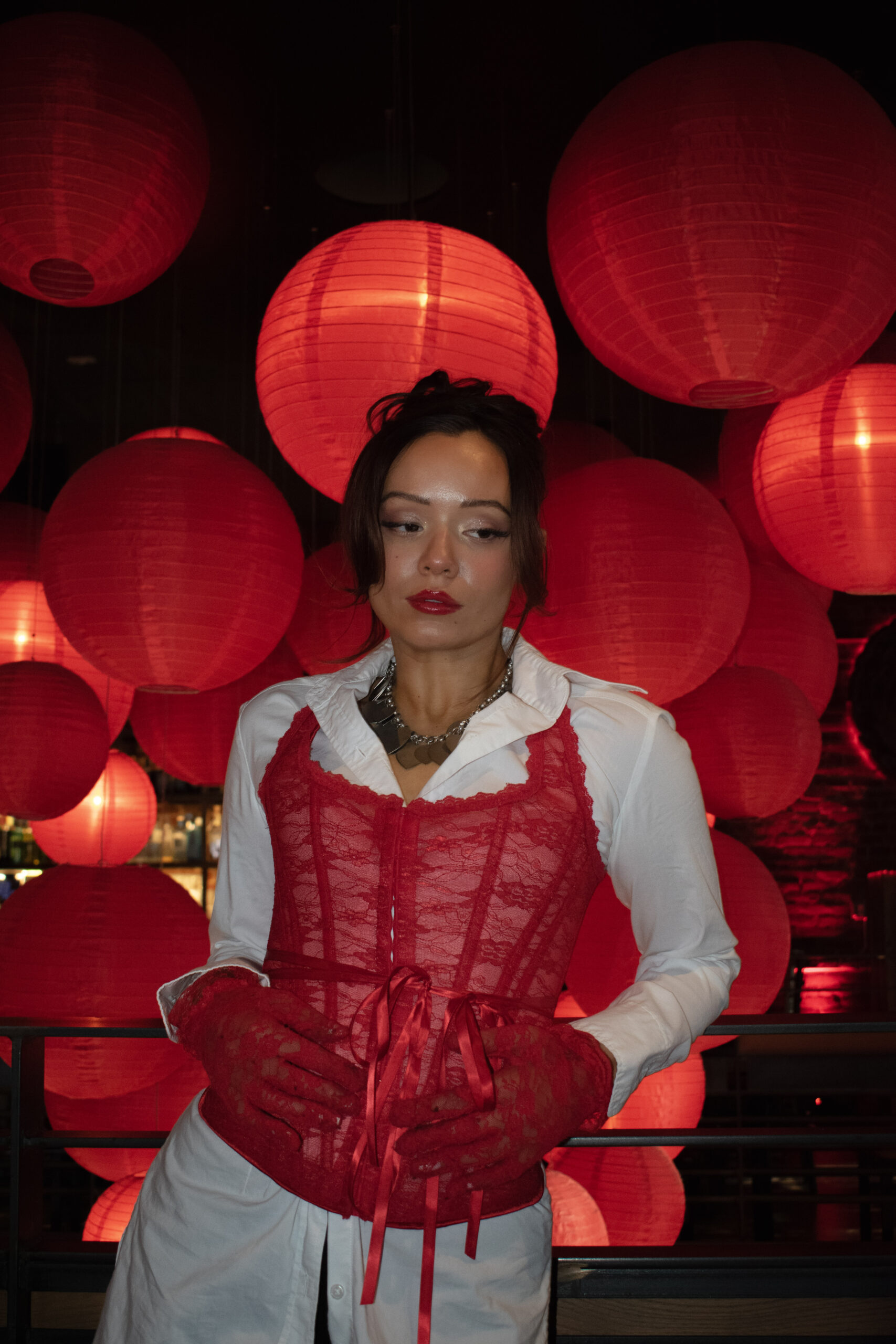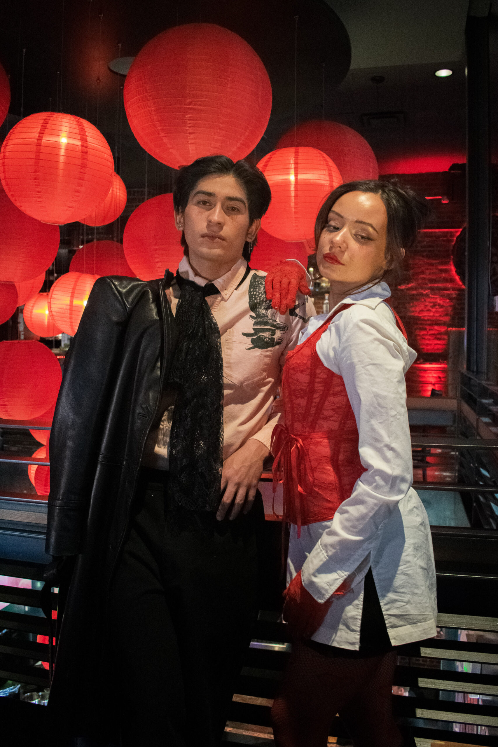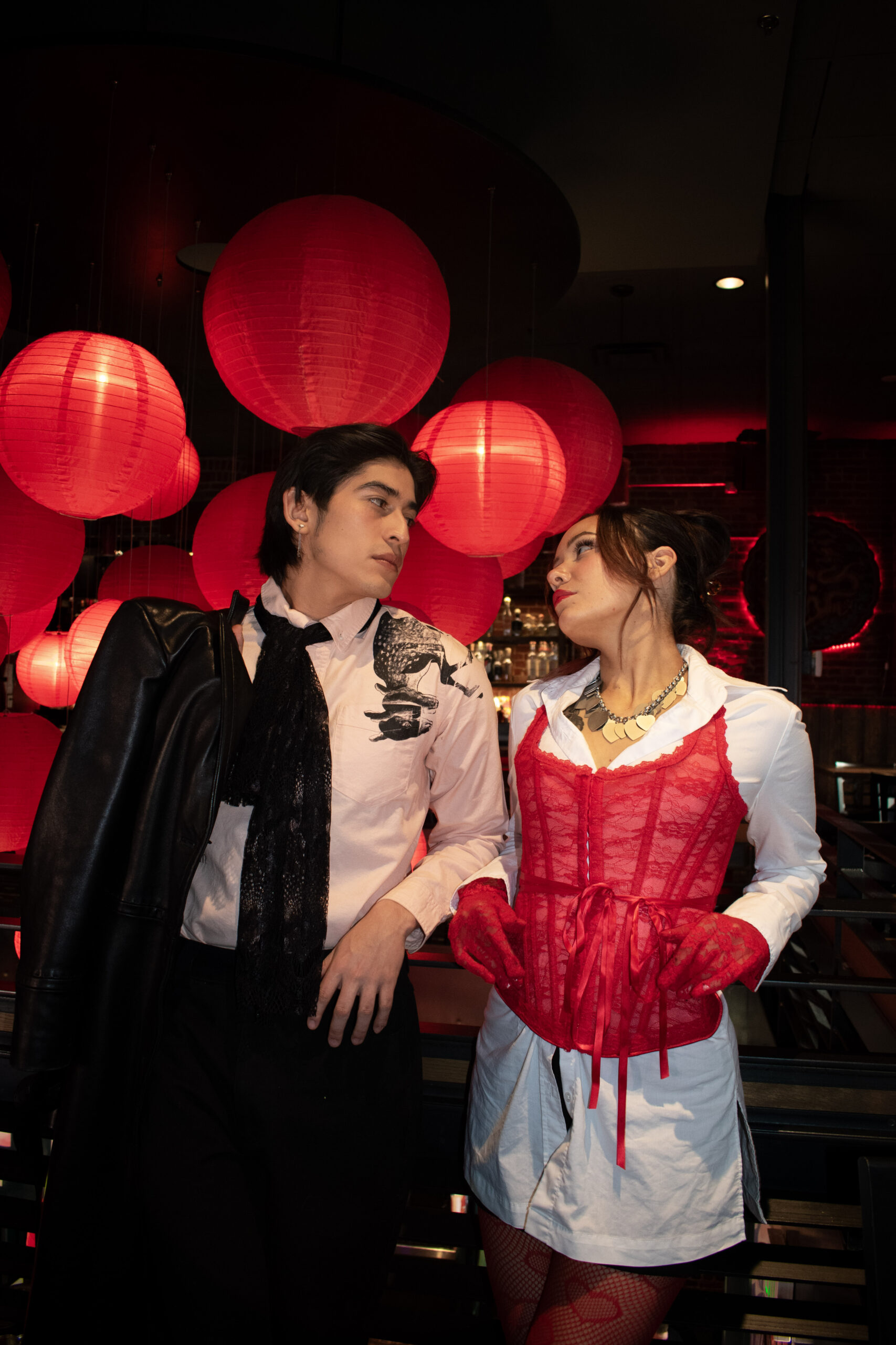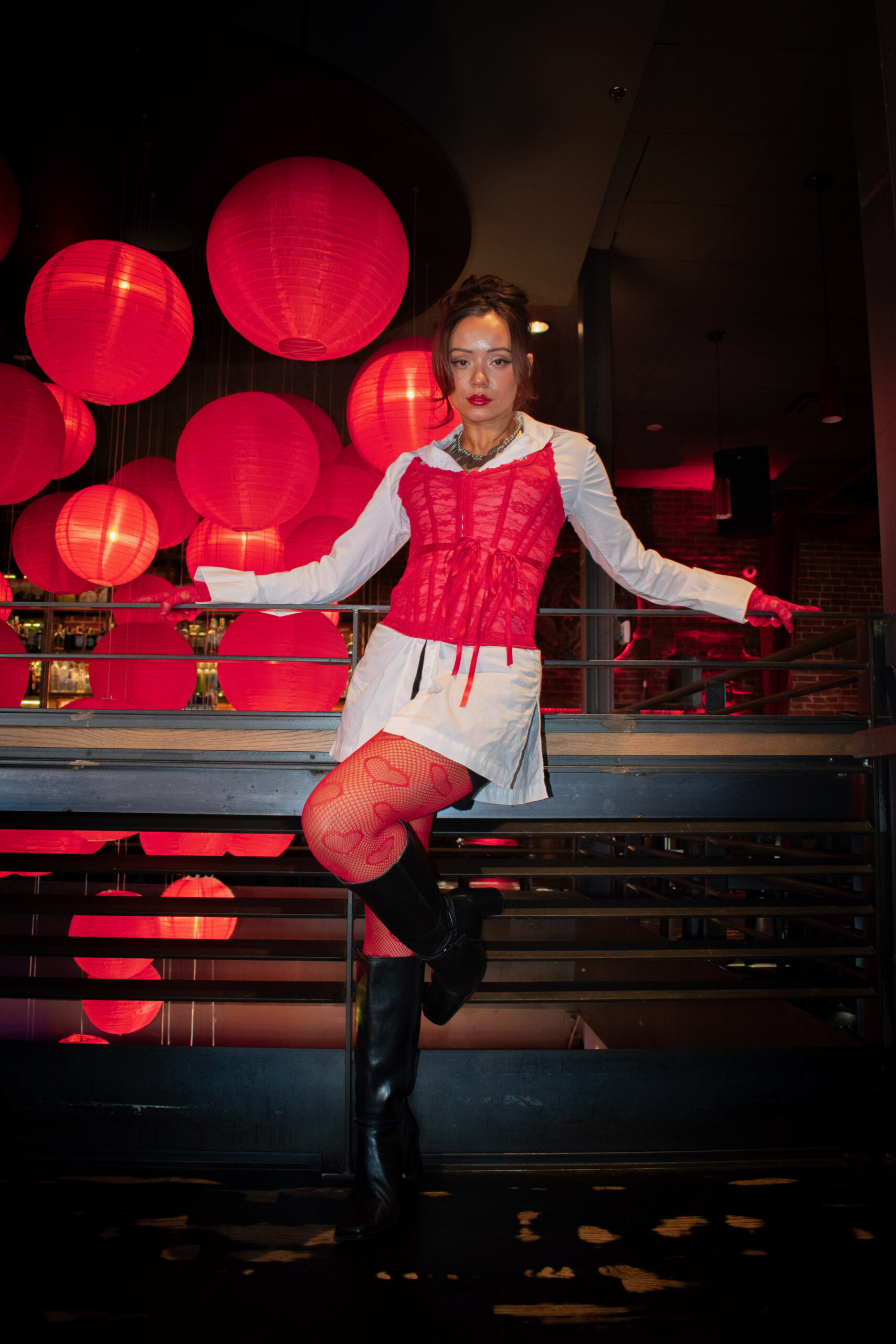 For an intimate setting, Bao Brewhouse, located in Larimer Square, hosts an upper room known as the Tea Room, lit by an illuminating chandelier of paper lanterns. This multi-concept restaurant combines fine dining with a twist. In a location this decorative and vibey, it’s time to turn up the romance. If you’re looking to dress on the fancier side but want to hold on to your creative sense of style, sometimes all you need is a classic button-up. For both looks, incorporating a structured piece like a button-up gave each look the perfect canvas to create a romantic fit. In our opinion, lace is the sexiest fabric, it remains timeless and is a great layering textile. This lace red corset top, as seen on Dewey, brought high fashion to the tea room and paired perfectly with a set of red lace gloves and heart-stitched fishnet tights. Lopez also sported a black lace necktie over the pink button-up by Modem.