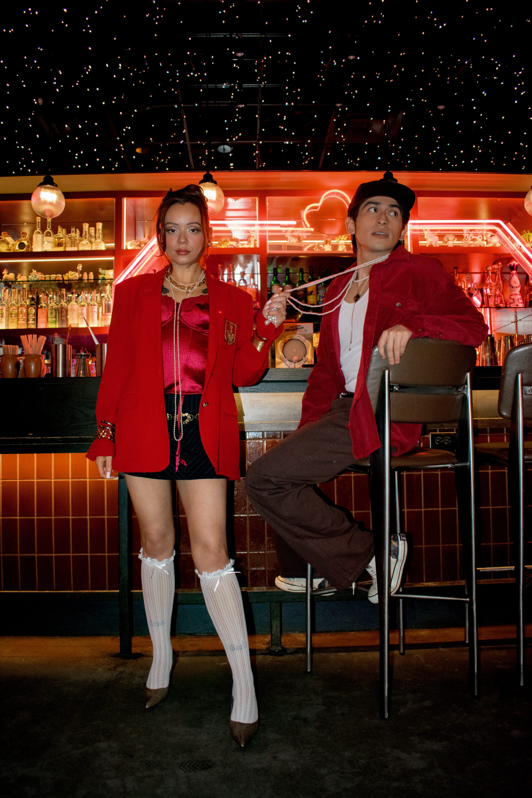 When it comes to a budding romance, having the right setting matters. Rather than opting for the classic candlelit dinner, start the night early at a vibrant and lively bar like Ghost Donkey. This colorful mezcal and tequila bar is the perfect setting to initiate more play into the evening when it comes to your fits and setting the tone for the night. Valentine’s Day is the time to add fun to your date night outfits with the help of sultry colors and classic accessories. For menswear, sometimes introducing more color and textures can be daunting. However, sticking to the classic base colors like white, black, and brown with a pop of red can go a long way. On model Alex Lopez, we stuck to the basics. Starting with comfort pieces from clothing brand Original Ugly, a white tank top, cargo pants and a brown Colorado initial hat allowed this look to start casual and end with flair. To add texture to his outfit, a red corduroy button-up and layering a pearl and gold bolo necklace made this look more defined and unique. Womenswear notoriously has more leeway when it comes to color and variety. On model Devynn Dewey, we went full send. Paying homage to the often criticized “matching couple’s outfits,” Dewey’s ensemble complimented Lopez’s look by pulling in brown and red colors with gold and pearl jewelry to match. Oversized blazers come in handy for a layered look that combines fitted and sexier pieces like a corset top and a black pinstriped mini skirt. One of our favorite accessories on Dewey is the long white lace-trimmed socks, which add a romantic element to the fit.