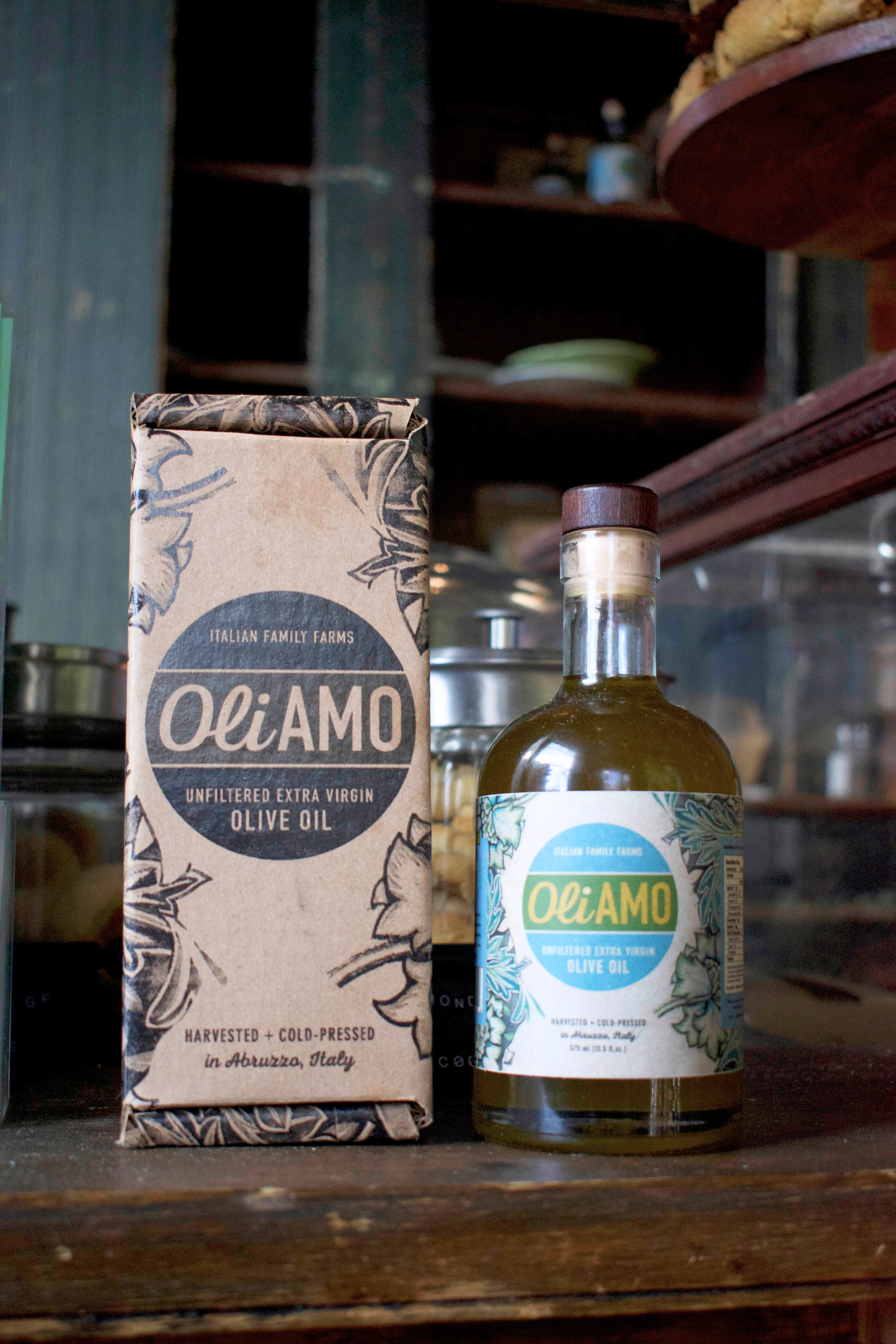 Home made Olive Oil from Pasquini’s family in Italy (left).