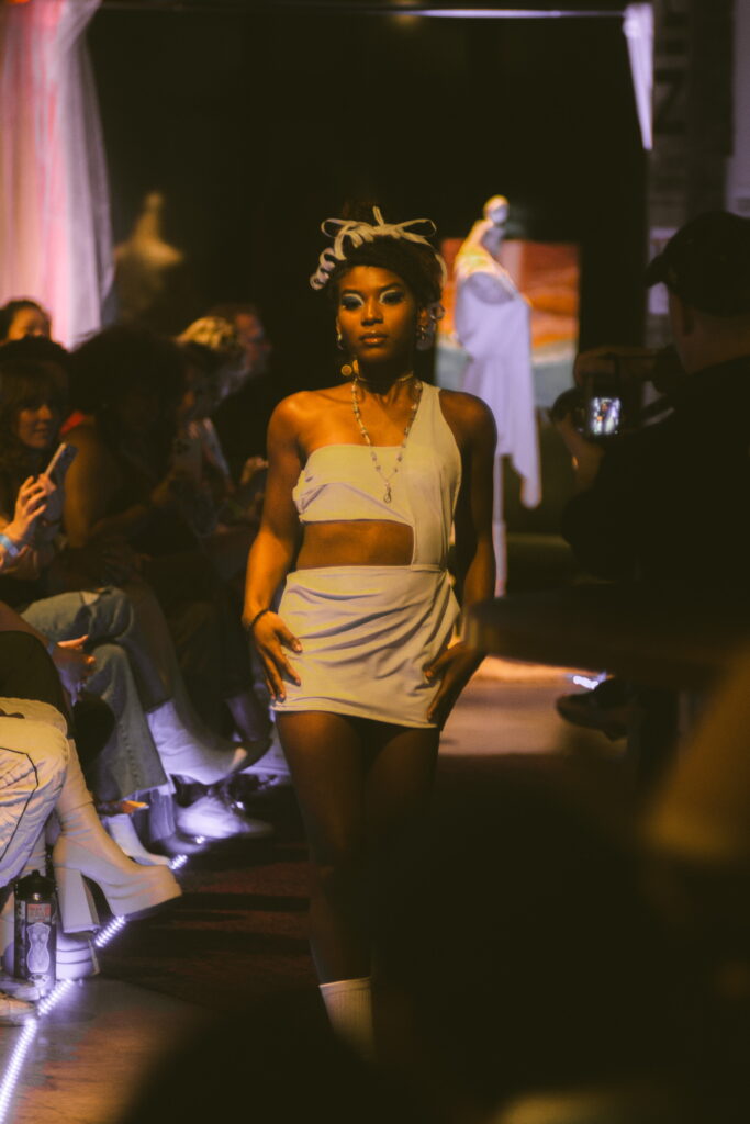 With elaborate makeup and white, flowing pieces, the collection felt otherworldly. The runway represented a fairytale as a nod to Kozy’s sacred space where she rests, retreats and is inspired by the work that comes to life on the runway. The angelic ambiance paired with simplistic looks felt like a celebration of the human body and mind, as well as all of the creativity that a fashion designer has to offer.