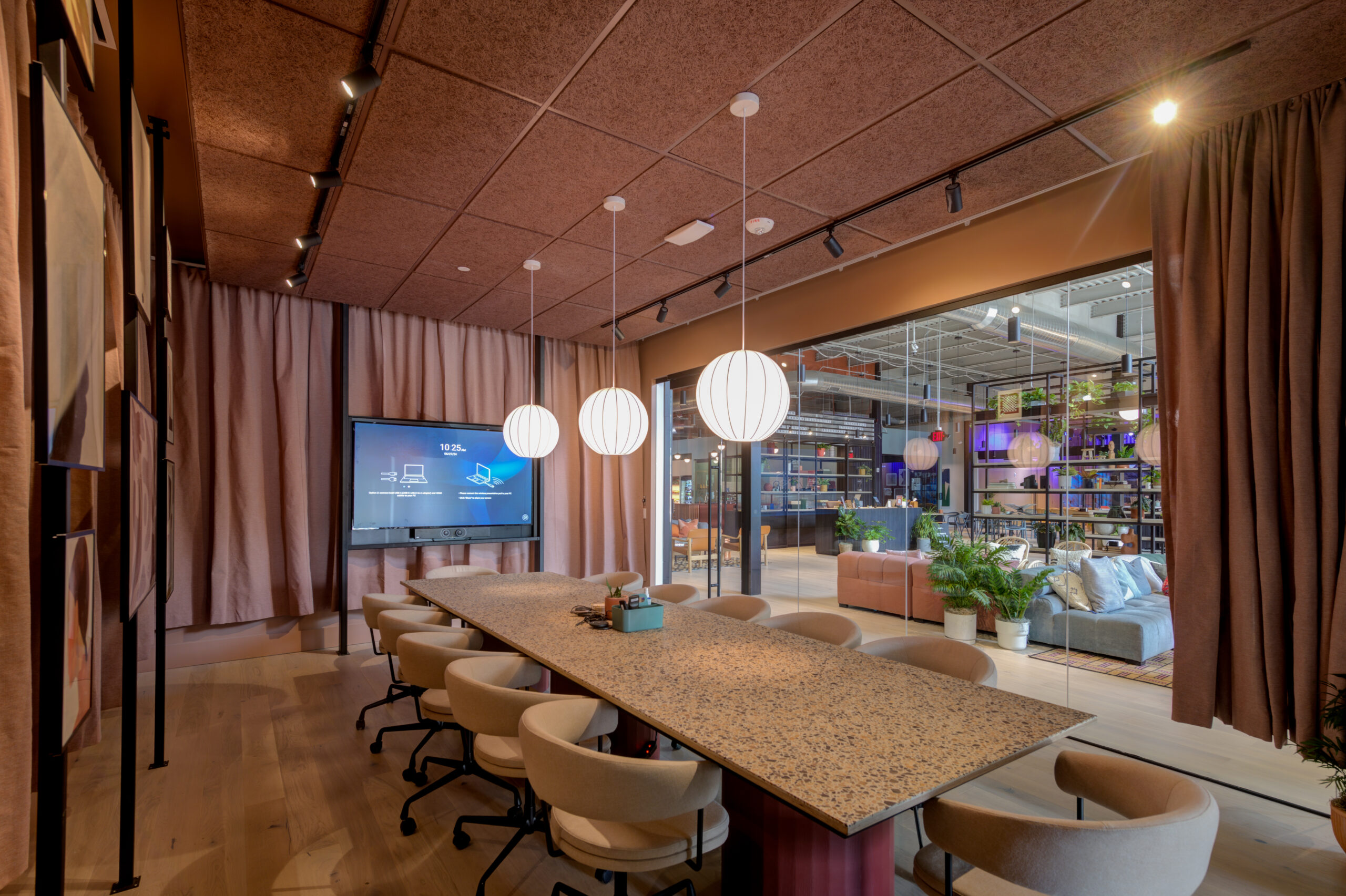These connections are influenced by the layout of the space. Radford explained that their decision for the reception area to be deeper into the space and not at the entrance was intentional. “We pulled it back to the heart and center of the building, and from there, you are connected to all the communal spaces. By creating this central node for everyone to pass, collisions begin to occur,” all due to how the space is organized.
