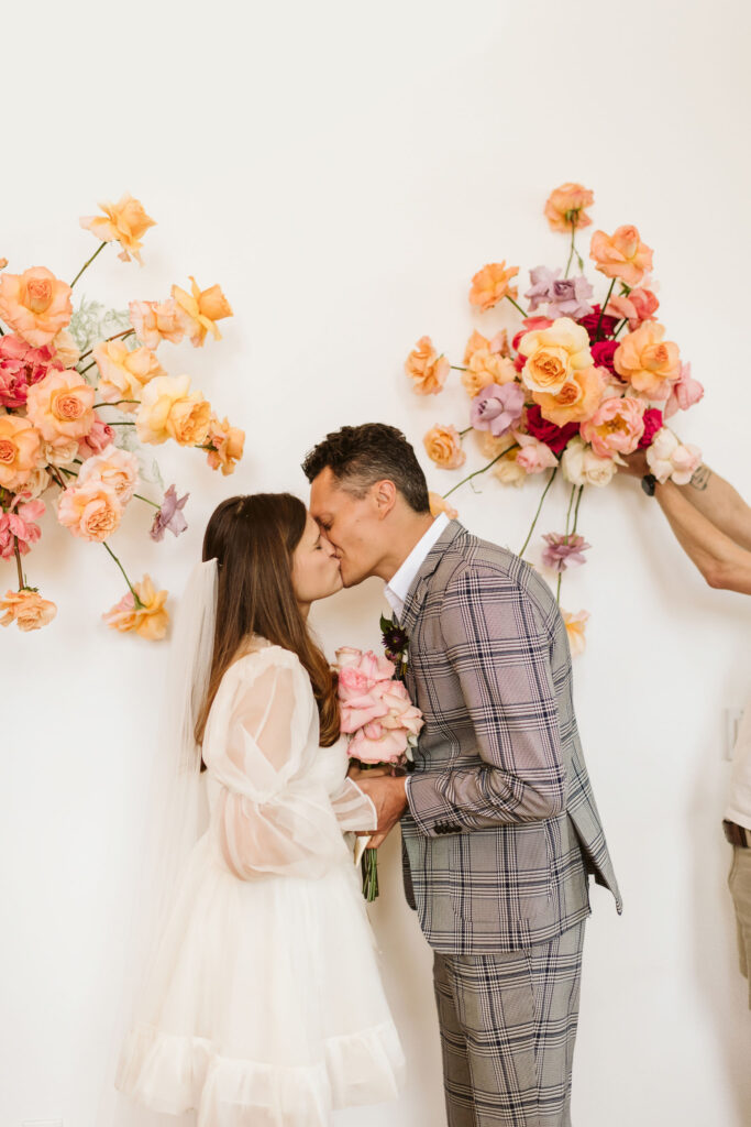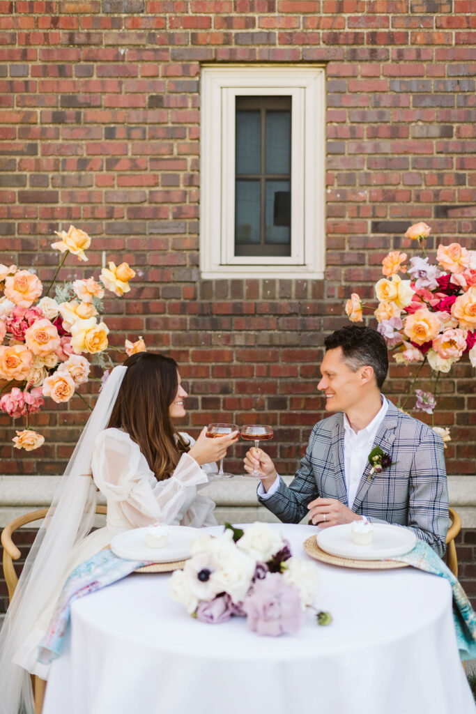 “Guests will arrive 30 minutes before their chapel appointment and will be greeted with welcome champagne or sparkling cider in the welcome lounge. The nearlyweds will receive their personal florals – whether they want bouquets, boutonnieres or a combination of the two. Then guests will be escorted into the Chapel, impeccably designed and decorated by KaraKara Blooms. There will be a short and sweet ceremony with a professional officiant, followed by a 45 minute reception in the chapel space with light bites, cocktails, mocktails and music. All the while, a professional photographer will be capturing all of the special moments. When their hour in the chapel is up, guests will be guided towards the exit, and the newlyweds will have an additional 30-minute portrait session with their photographer. Of course, if someone wanted a longer experience, they could book back-to-back appointments to maximize their time in the Chapel! After their chapel appointment, the newlyweds may choose to continue their celebration with an after party, but the beauty is that they can spend the day in whatever way feels best and the most authentic to them.”