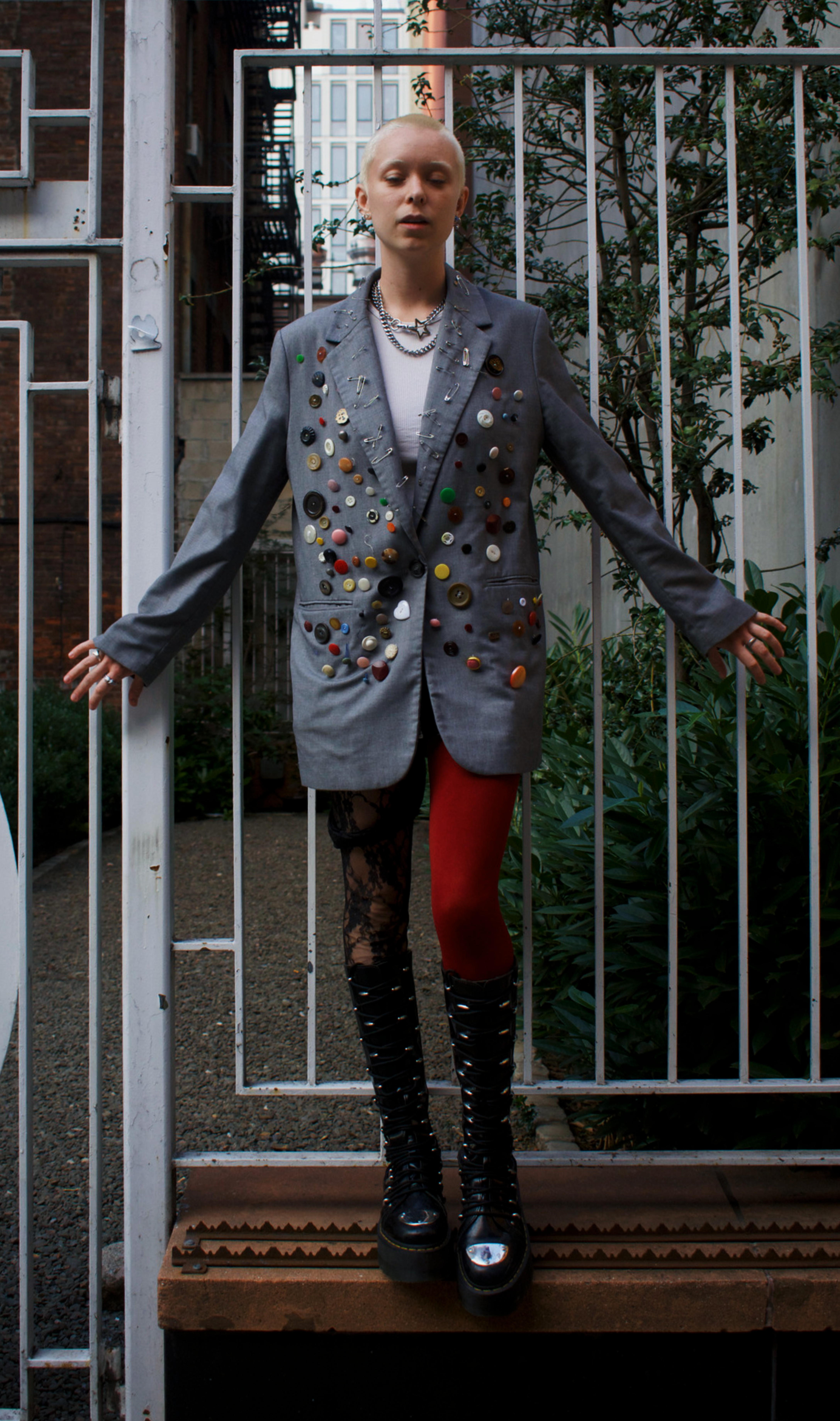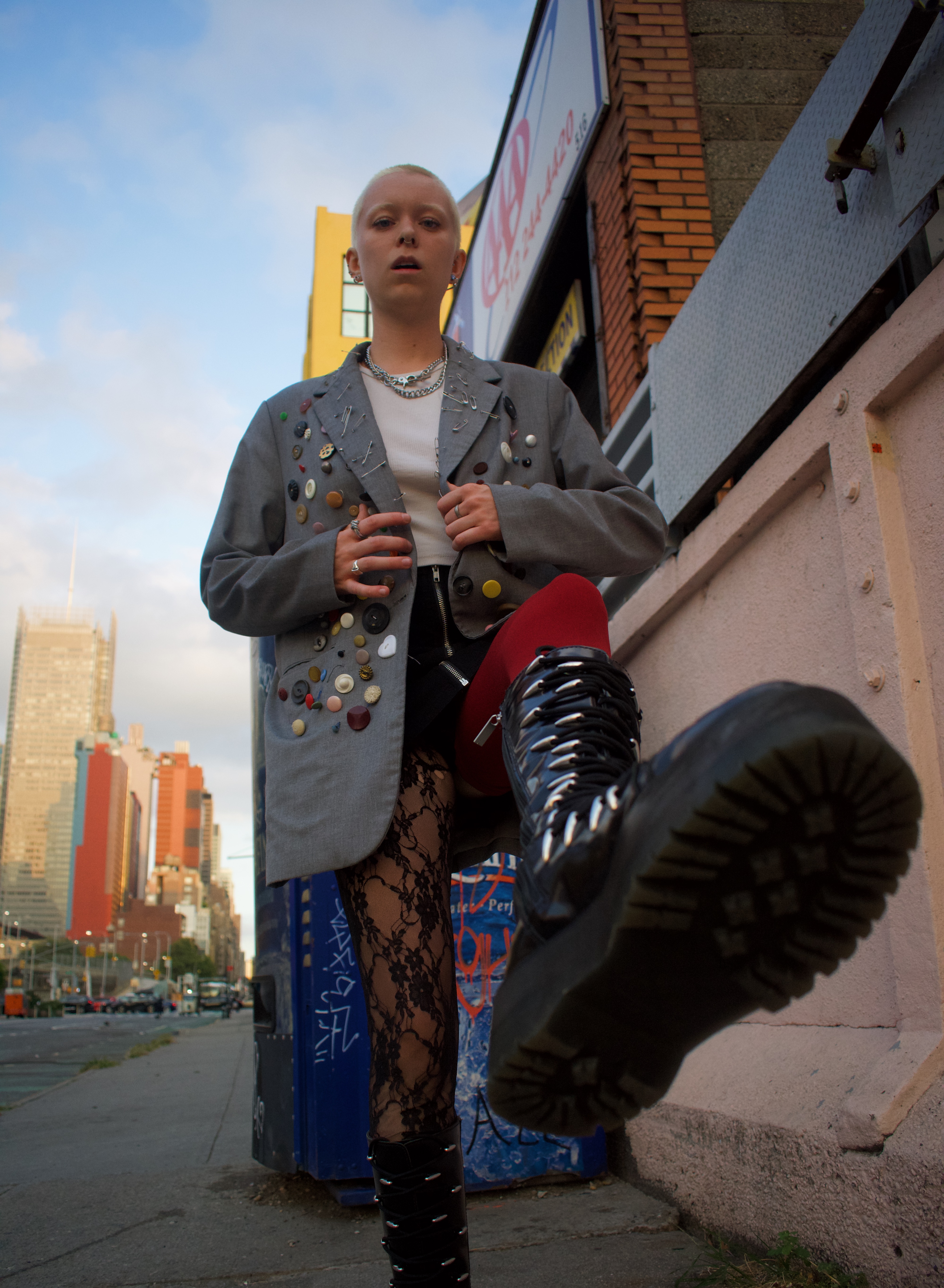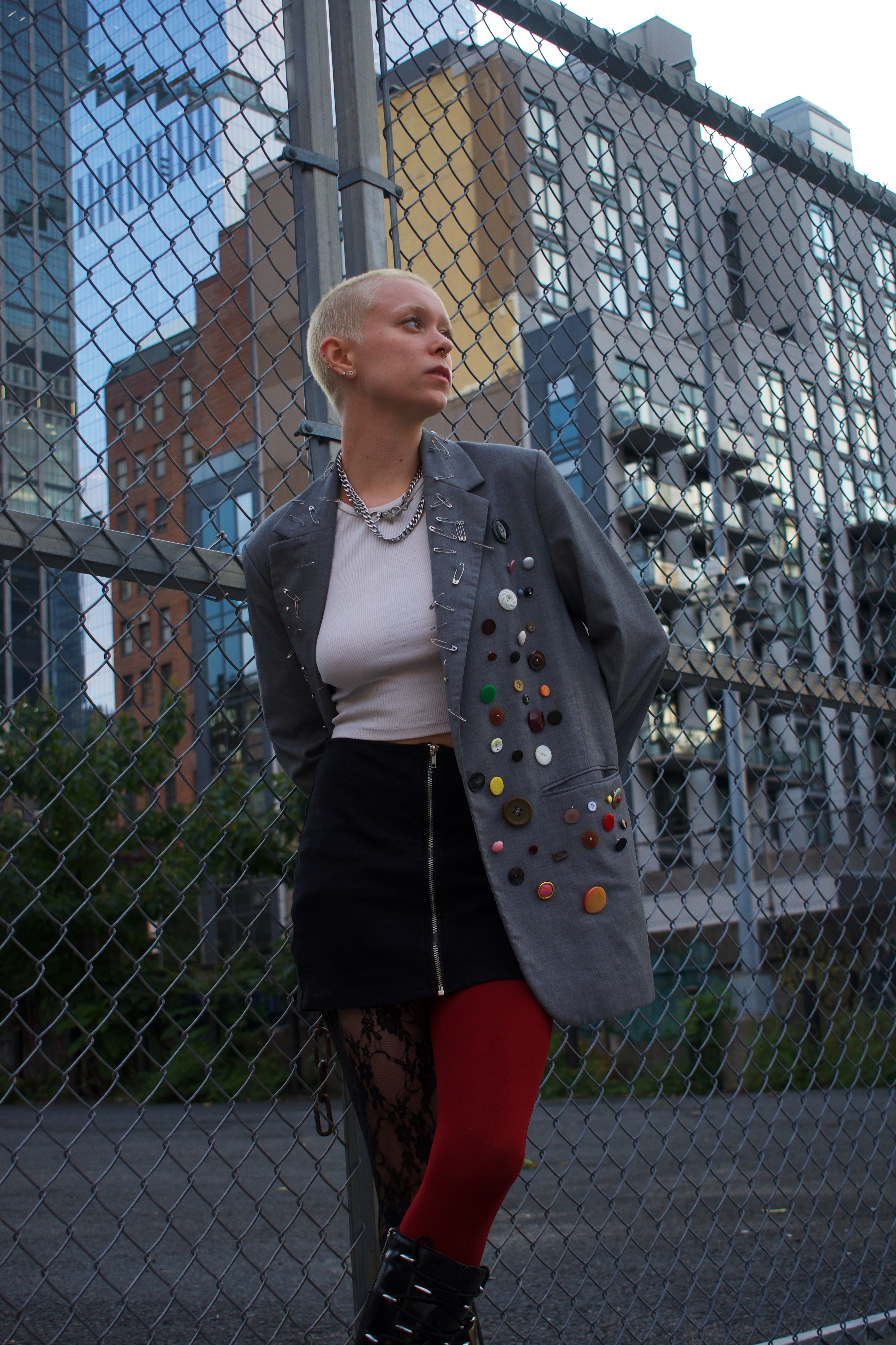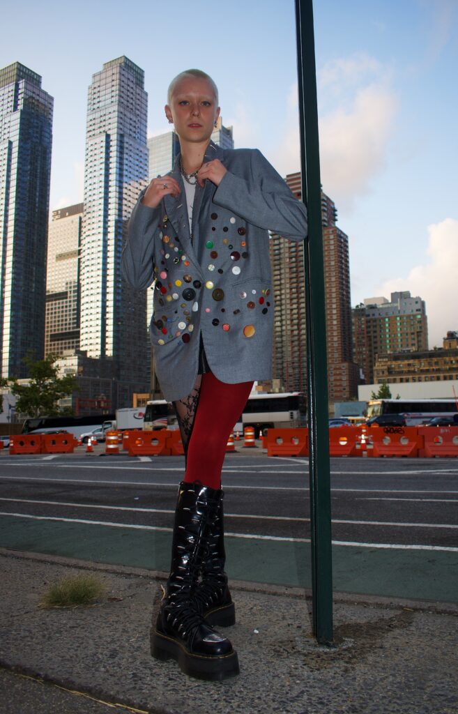 On any given day, you can find Denny in a plaid or tartan skirt with fun boots and a tank top or tee shirt littered with accessories. With inspiration from Vivian Westwood and NYC-based brands, Denny finds a way to bring a unique flair to their more preppy base layers. In line with their general aesthetic Denny came prepped for the shoot with a hand-decorated blazer, mismatch tights and chunky NYC-friendly boots.