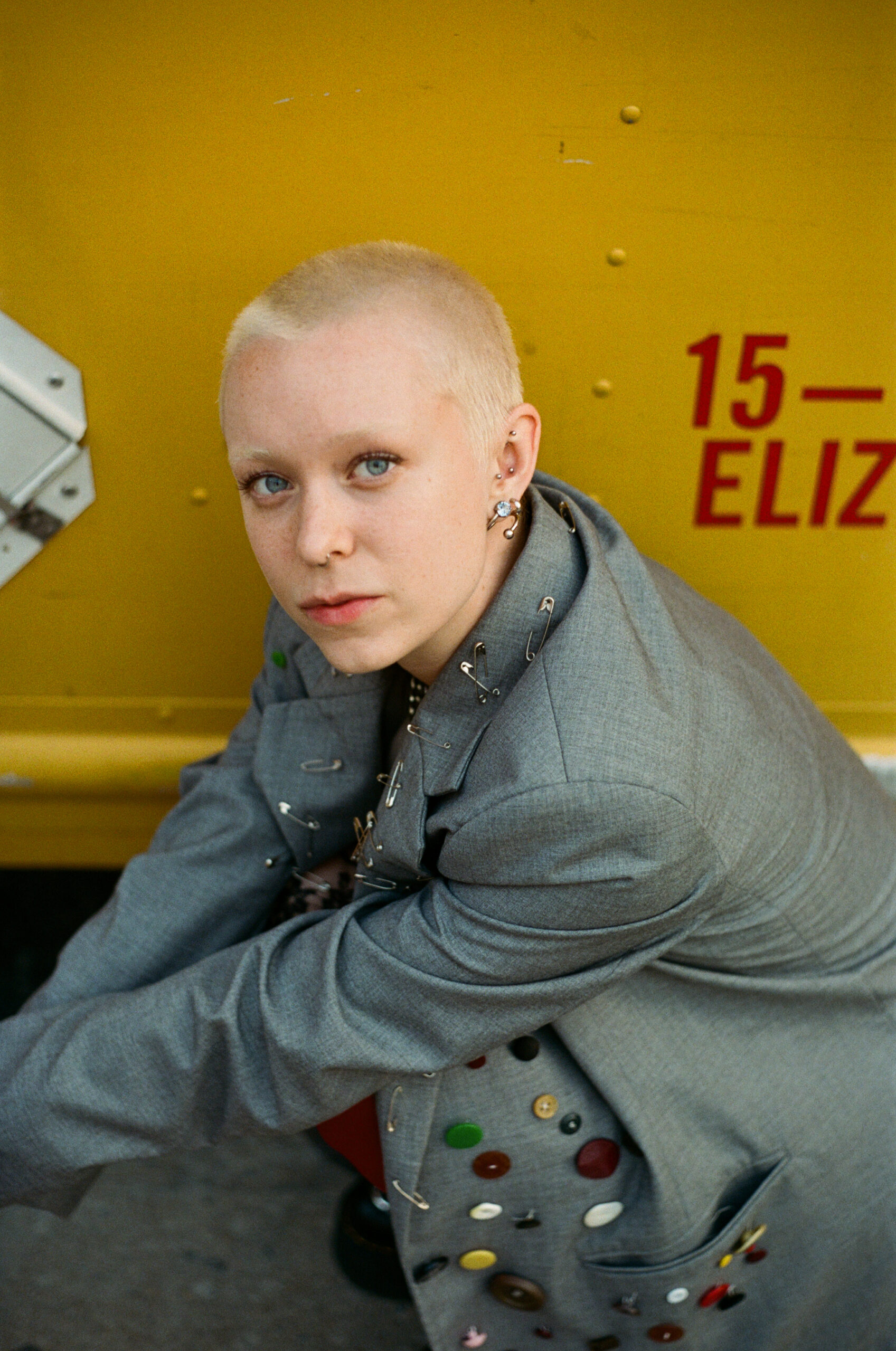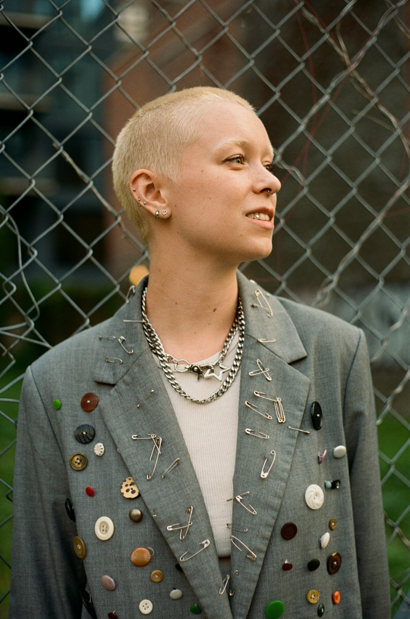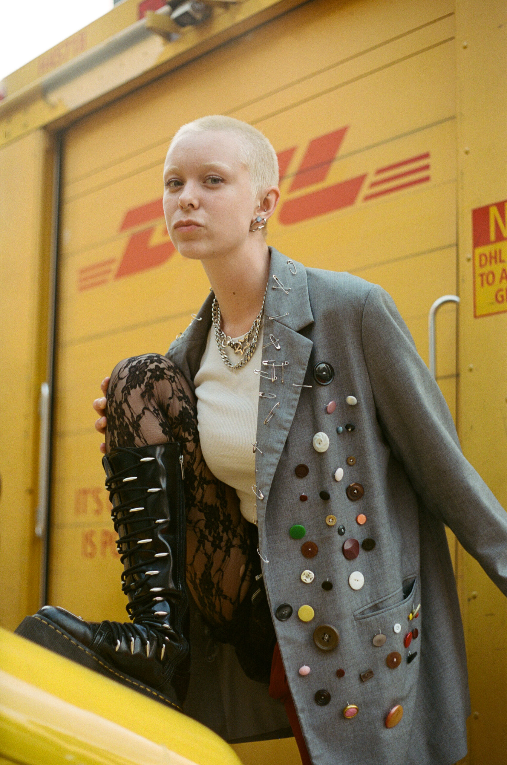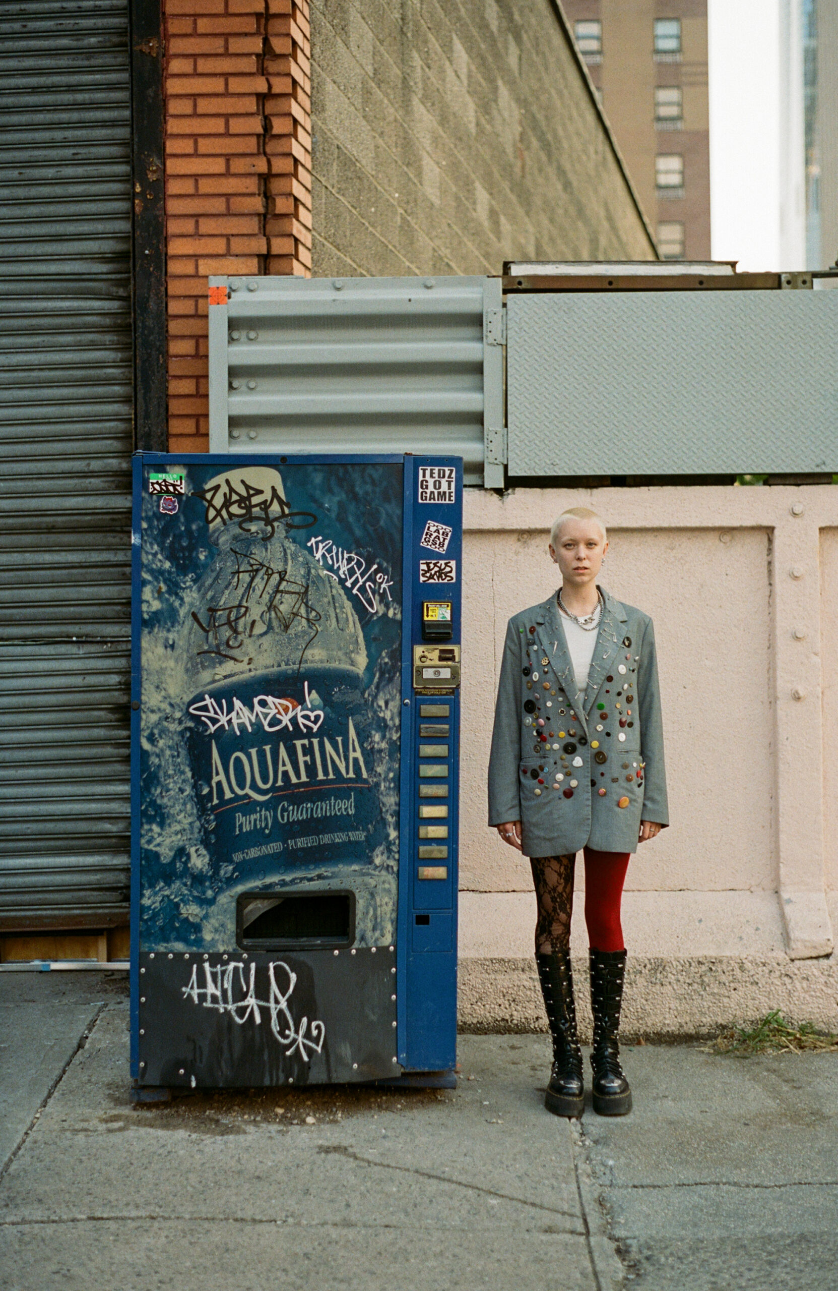 On any given day, you can find Denny in a plaid or tartan skirt with fun boots and a tank top or tee shirt littered with accessories. With inspiration from Vivian Westwood and NYC-based brands, Denny finds a way to bring a unique flair to their more preppy base layers. In line with their general aesthetic Denny came prepped for the shoot with a hand-decorated blazer, mismatch tights and chunky NYC-friendly boots.