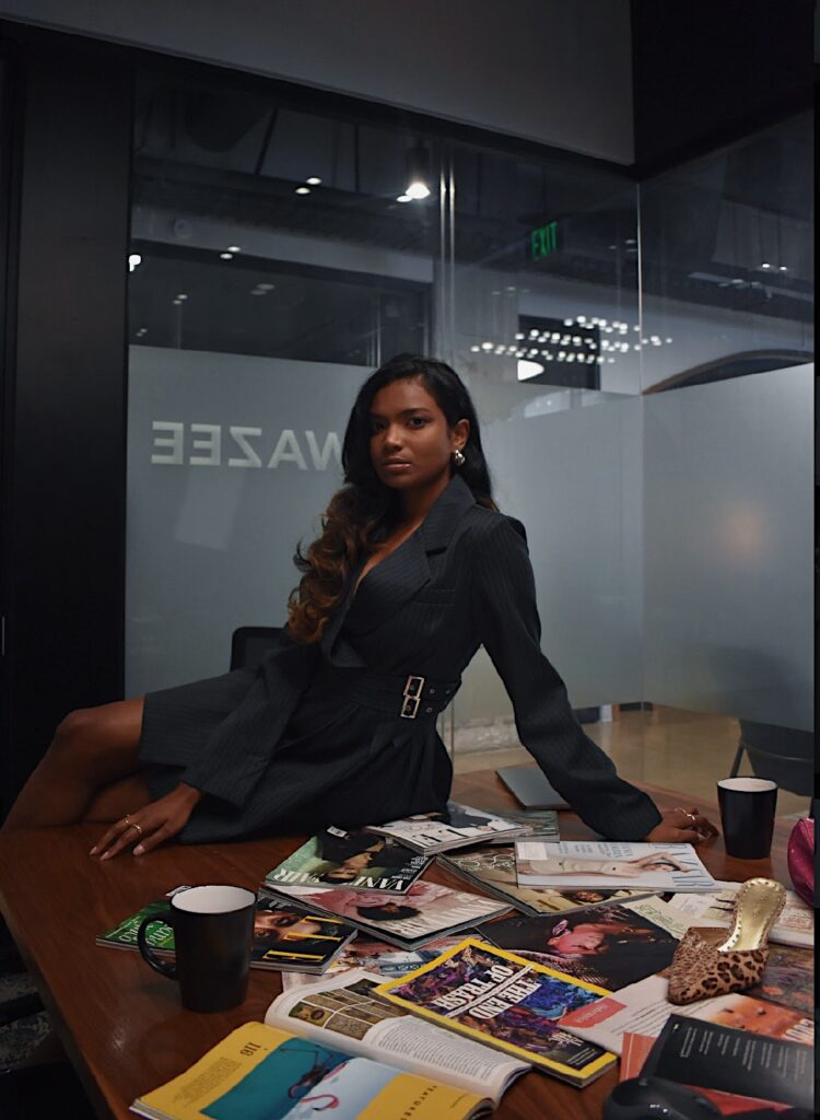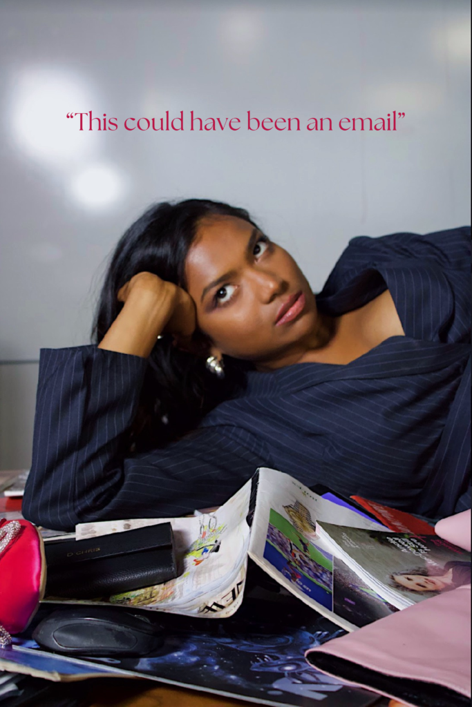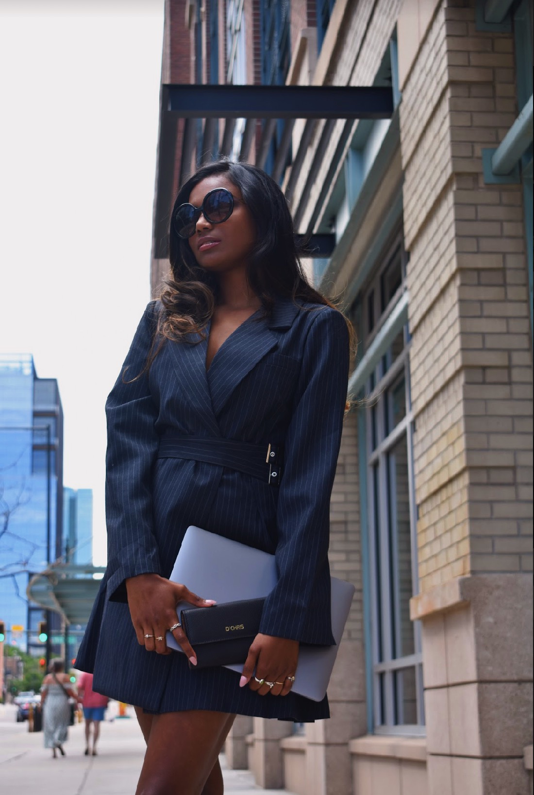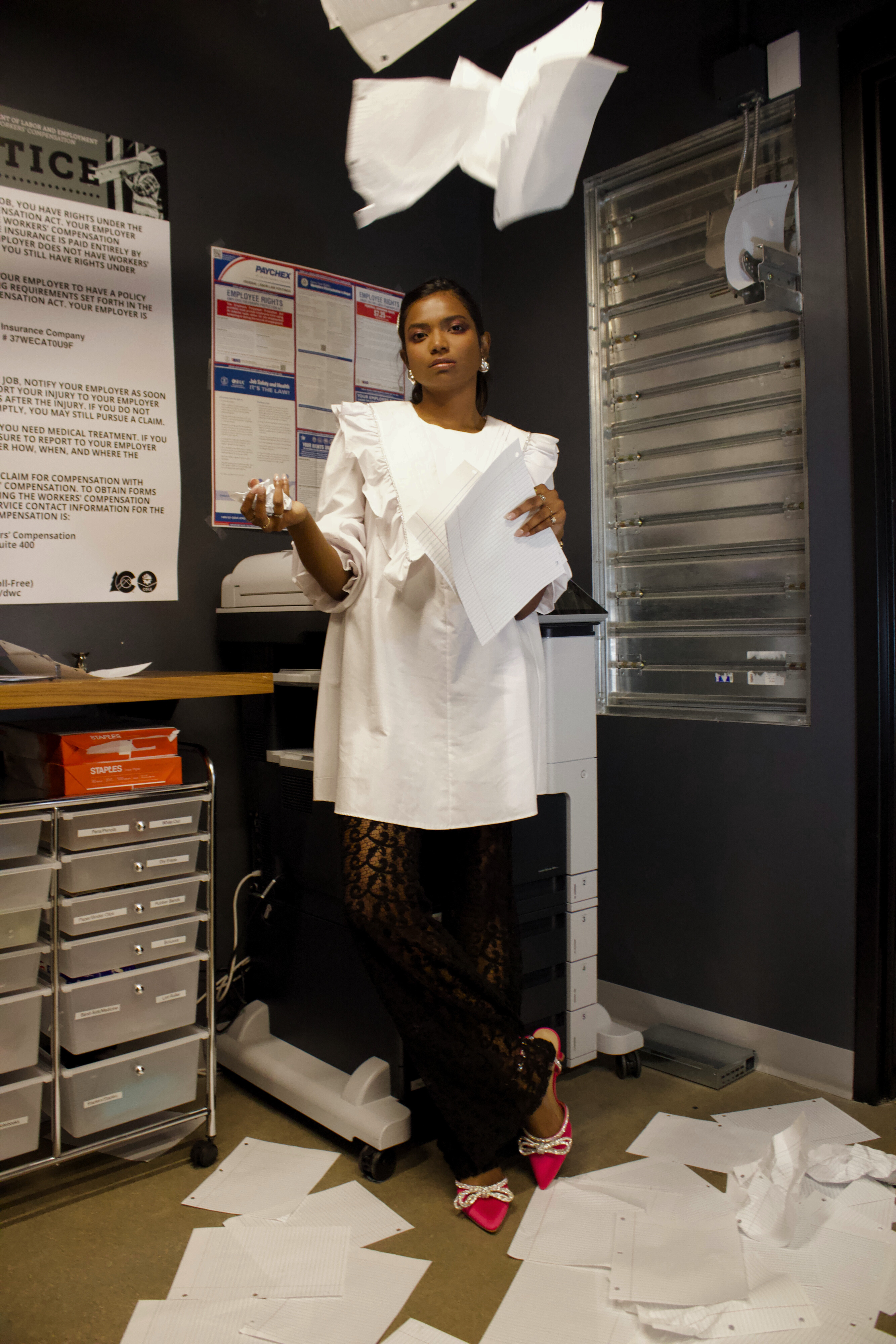 Deep dive: She’s booked, she’s busy, but she’s not boring. For the boardroom badass, suiting up in an outfit that commands the room while checking off agenda items will brighten up any stuffy meeting. Layering and embracing fitted silhouettes can upgrade classic base colors like black, white, navy and gray. In this case, pinstripes got an upgrade in the form of a fitted mini-suit dress with box pleats and silver double-belted details. There’s no doubt that a white button-up is the ultimate office staple. Its legacy is boundless, genderless and timeless. It has the capacity to serve as the perfect canvas for a well-refined look. To add some flair to this neutral piece, opt for a white button-up with added details like ruffles, unique cuffs or a collar tie. The white button-up with a black collar tie was paired with a high-waisted black skirt with metallic button-down finishes. For this look, we converted the skirt into a strapless dress so the shirt can act as a layering piece. To close the loop on this elevated look, we tied the collar into a bow and added a gold snake clasps necklace and a vintage broach.