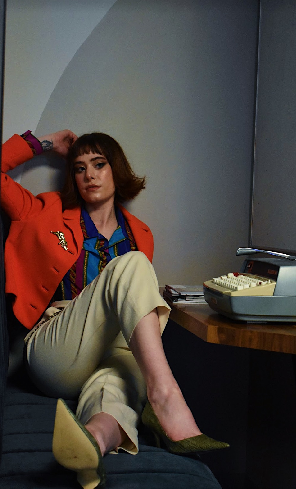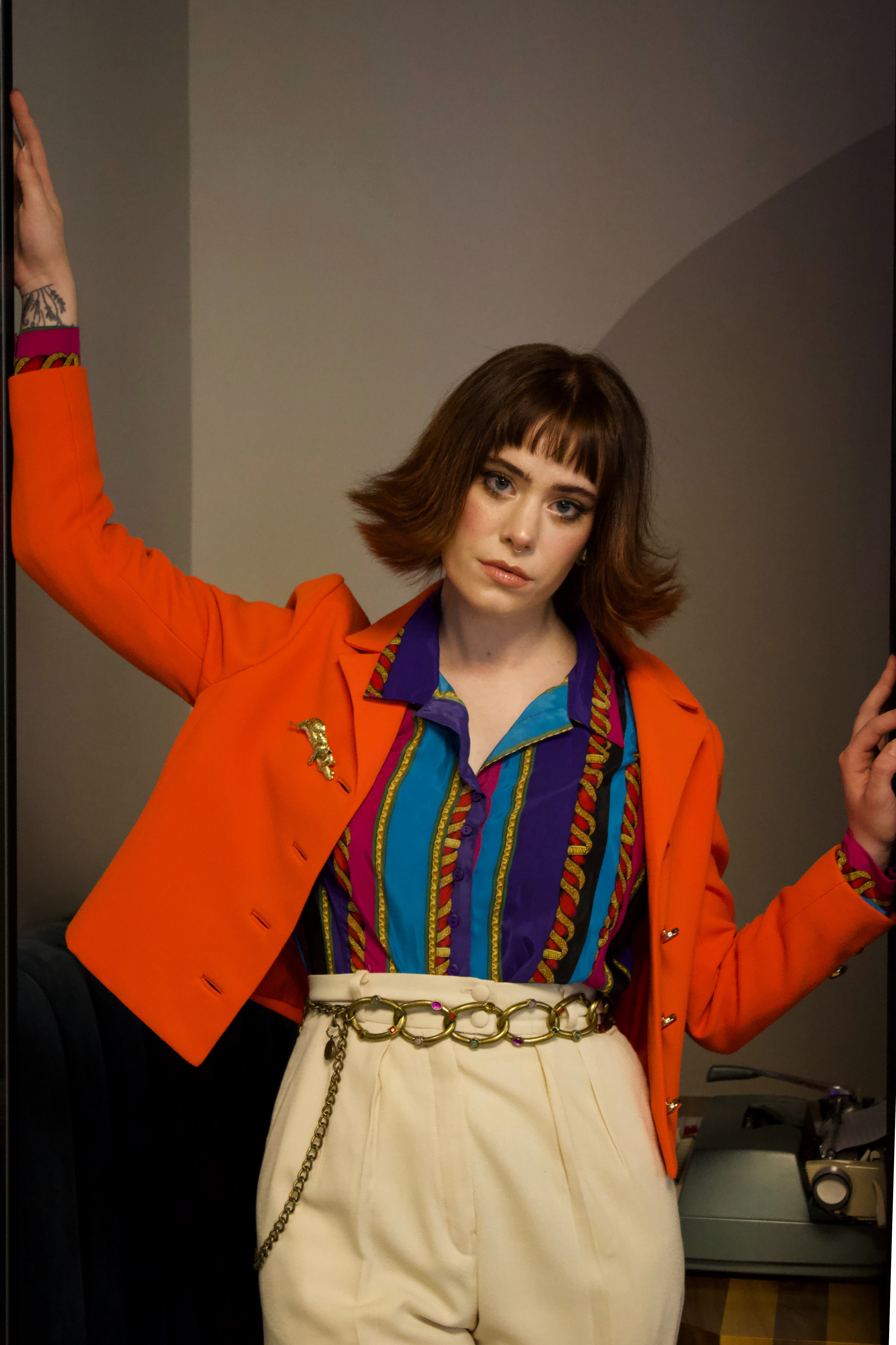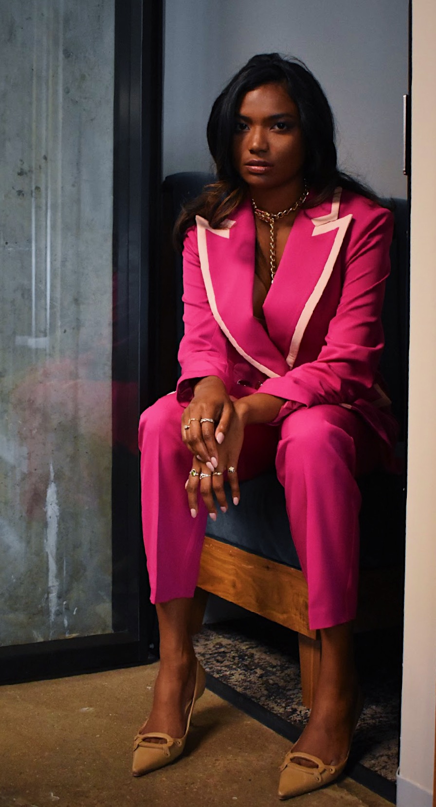Deep dive: Bold colors, ornate patterns and vintage accessories are a chic and elevated spin on the classic pantsuit. Although these outfits may be bright, they definitely do not lack in structure. A tailored fit has the power to make anyone feel polished and put together. To embrace the essence of summer, we suggest pulling in citrus and warm colors as seen on Uppalapati and Good. This bombshell striped set from M.Bolden Boutique puts the power in power suit. With a suit this vibrant, you don’t need to go overboard with the accessories. To let this look speak for itself, it’s complimented with vintage Jimmy Choo kitten heels and a thick gold chain necklace. Good is rocking everything vintage with a bold citrus blazer as the focal point. With styling, we didn’t allow just one color or pattern to limit our styling choices we embraced them! Utilizing the science behind complementary hues on the color wheel, this vintage 80’s chain pattern button-up from vintage shop, stylist and curator The Denver Ginger, paired well with this vivid blazer as shades of blues and purples are complementary colors to orange and yellows. To pull out the chain design from the blouse, a multi-jeweled chain loop belt was paired on top of high-waisted tailored beige pants.