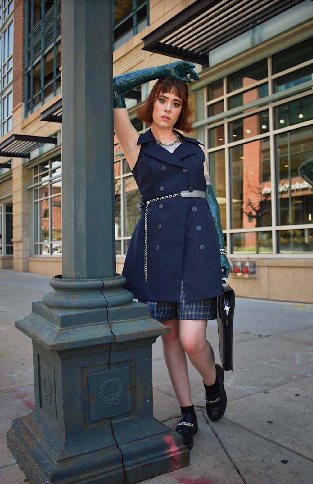 Deliverables: On Good: 90’s Plaid Trouser Shorts, $32.00, provided by The Denver Ginger. Navy Double Breasted Vest, and Silver Chain Belt,  provided by Lisa Mae (Thrift Girlie) – Style Bundles available HERE. On Uppalapati: White Long Collar Tunic, $67.00, Lace Trouser, $30.00, available at M. Bolden Boutique.