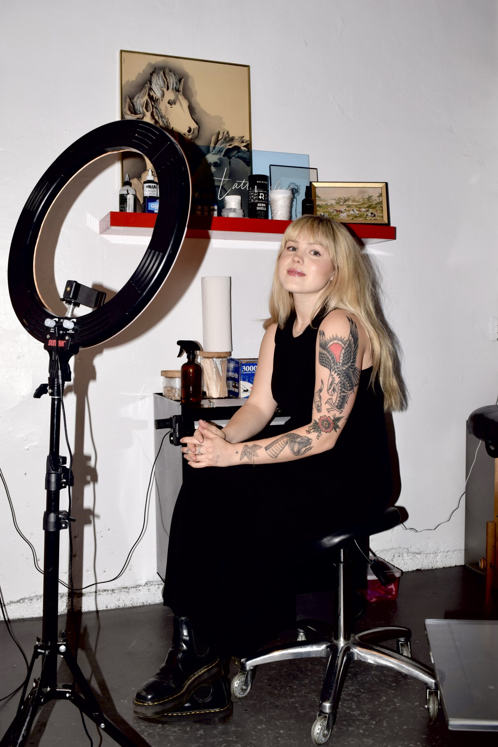 “Think of how many things we have in our lives that are actually with us until the day that we die,” said Alexis Samuels, the steady hand and divine illustrator behind Tattoo by Lex. Surrounded by natural light illuminating through the garage doors of her new space, Samuels etched my 12th tattoo onto my forearm – one of the 10 she has given me. Adding more personalization and beauty to her new space is vintage clothing by her best friend Chase Austin of Dusk Threads.