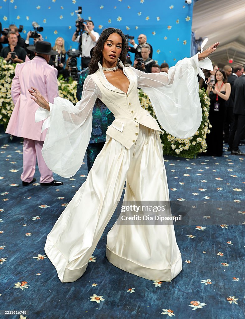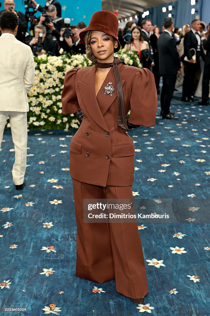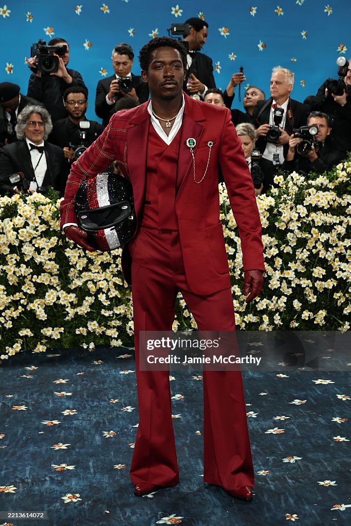 Are we finally entering a time where we can retire a boring plain black suit? Not so much… A$AP Rocky rocked a black suit adorned with a broach, and Law Roach wore a black velvet burnout suit by Burberry. With this in mind, black suits don’t have to be boring—it’s all about how they’re layered and accessorized to make a statement. That jaw-dropping moment when Damson Idris stepped onto the carpet wearing a race suit only for it to be ripped off, revealing a bold red suit… yeah, that was hot. Suits represent power, refinement, and elegance. We have a feeling we’ll be seeing a lot more women rocking a tailored suit or going the Laura Harrier route with custom beige wide-leg pants and a tailored vest under a sheer long puff-sleeved shirt— all designed by Zac Posen and Gap Studio.