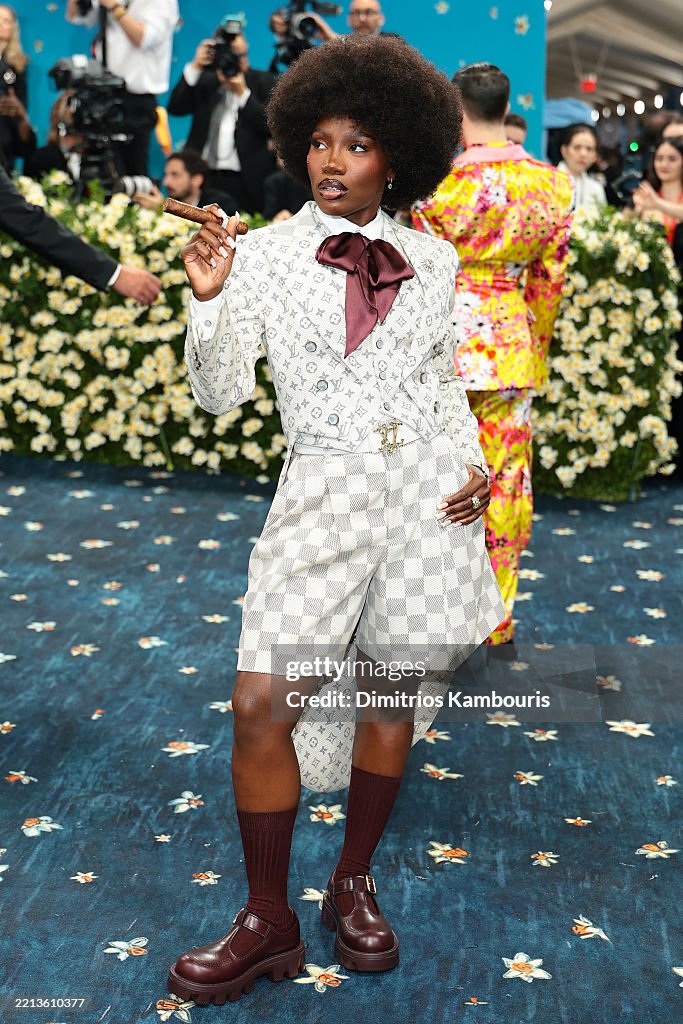 Our favorite look of all? Doechii in her custom Louis Vuitton short pantsuit. Short dress pants, a vest and a silk necktie are a recipe for an edgy fashion-forward summer outfit.